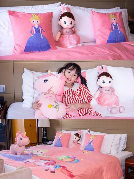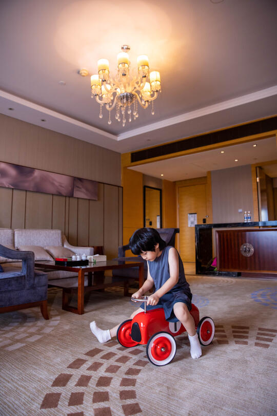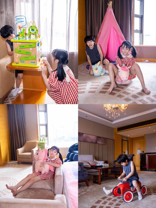 活力套房,面积大,配备衣帽间,比较稳重大气大商务装修风格,工作人员知道是两个孩子入住,特意布置了下,房间秒变乐园!主题帐篷+室内玩具+卡通布置,宝贝放电100%;