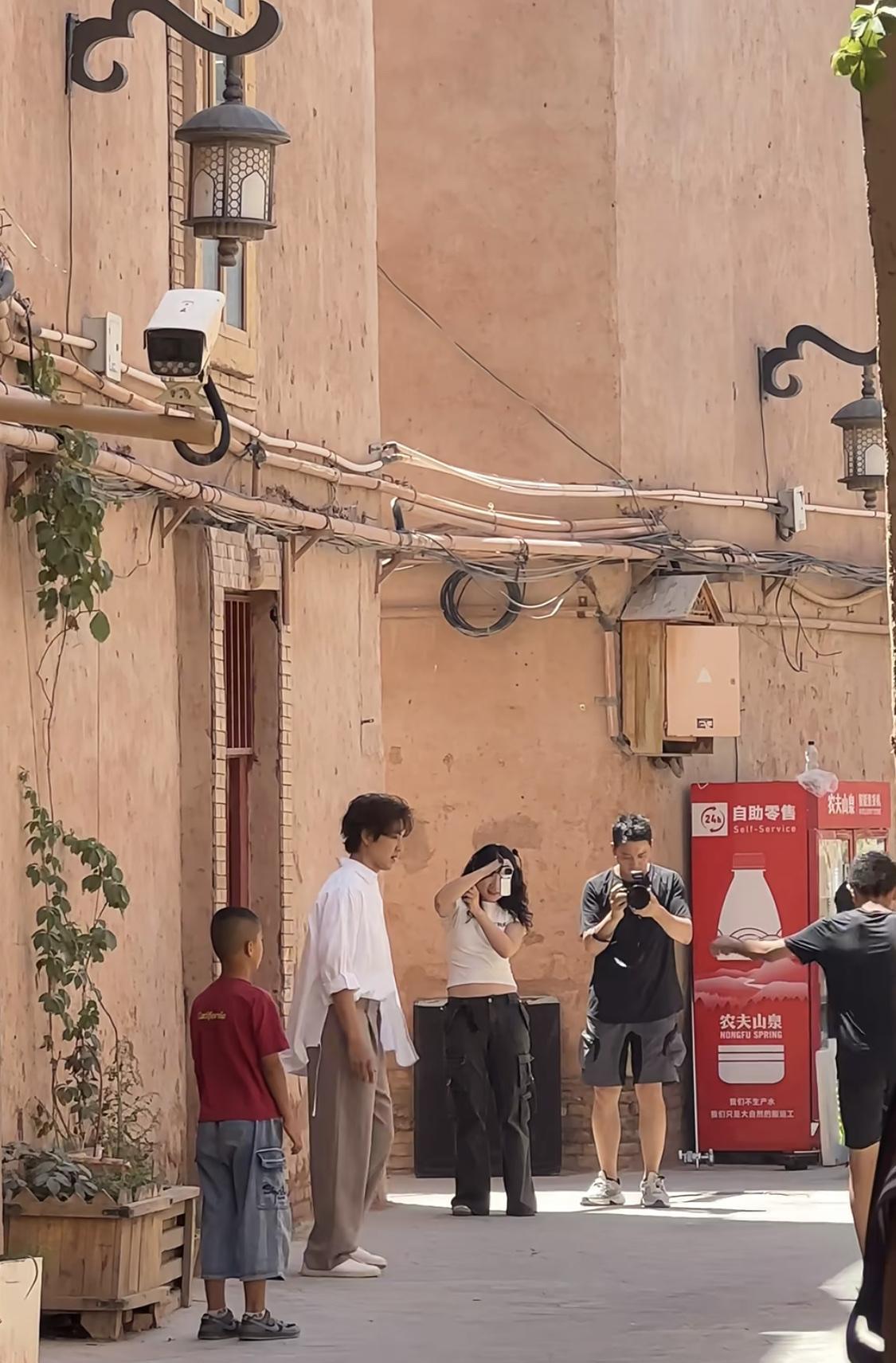 钟汉良在喀什古城和小朋友踢足球,在巷子里面的阴凉处。 当天30多度的高温,钟汉良