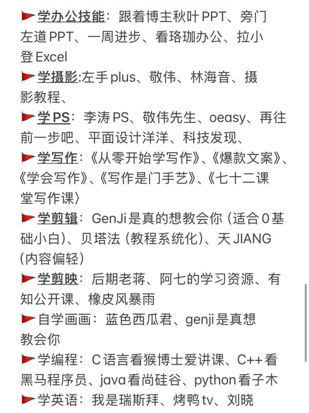 学办公技能、学摄影、学PS、学写作、学剪辑、学剪映、自学画画、学编程、学英语、提前熟悉各学科名师、运动健身