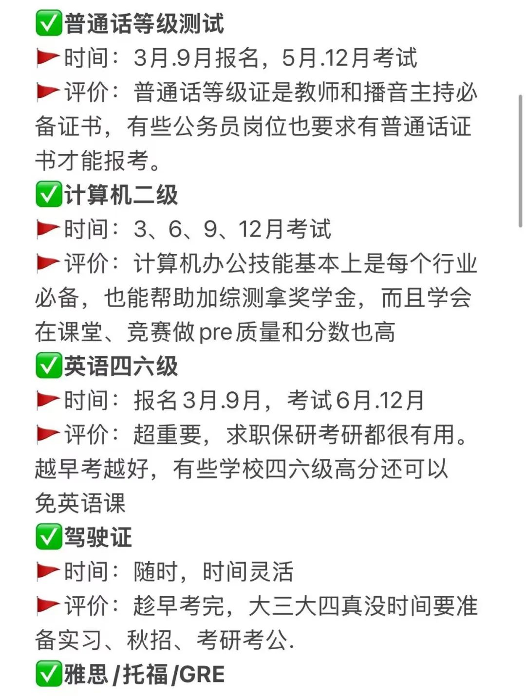 普通话等级测试、计算机二级、英语四六级、驾驶证、雅思/托福/GRE、导游证、心理咨询师、播音主持证、自考本科、BEC商务英语、翻译资格证Catti、第二外语证书