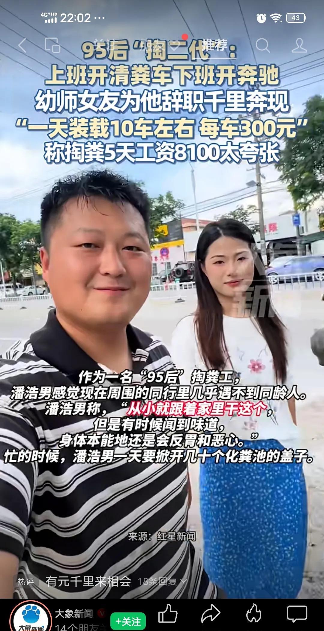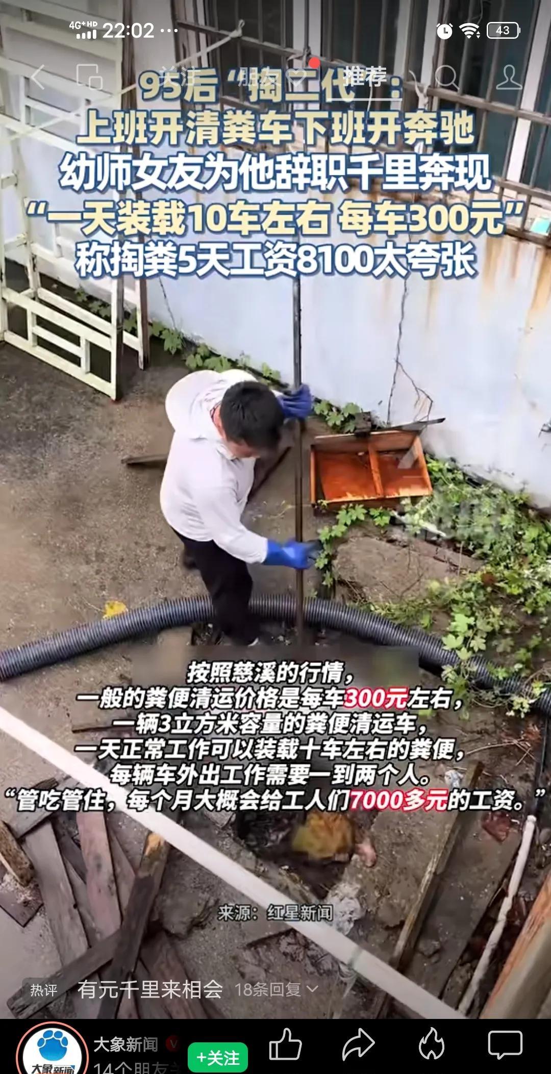 上班掏粪,下班开奔驰, 幼师女友,辞职千里奔。 年轻小伙,打破非常规, 粪坑淘金,实现好人生。 谁能想到,一个90后的年轻帅小伙,他的职业,好多人不敢“沾边”,因为实在是非一般人能“忍”。 “掏粪”这个职业,在我们大多数人印象里的,只有那种年龄大、文化不多、受得了苦的人,才会去做。谁曾想,一个年轻小伙却把“掏粪”搞成了事业,不仅成功积累了财富,还成功收获了爱情。因为他的“掏粪”事业,让我从新认识了这个不起眼的“工作”。 有没有和我一样,对“掏粪”有了新的认识呢?