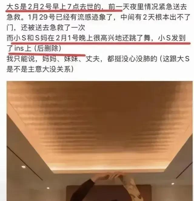 大小s这对姐妹,现在来说说小s对大s,感觉就是那种相爱相杀的姐妹。 妹妹嫉妒姐姐是真的,不盼着她好也是真的,但是,并没有狠毒到盼着她去死。为啥最后发展到姐姐猝死了呢?也很简单,俩人的关系,一直就是,一到出钱,就是大s来。小的,没有出钱的习惯。 从小在一起,姐姐事业比她成功,嫁的人也比她有钱且大方,这实在是让她嫉妒。她有意无意的乱撩姐夫,也是她恨不得姐姐婚姻有点乱才符合她心意。 她有时候对姐姐口无忌惮,也是实实在在的抓要求博流量,至于把姐姐闺房里那点私密事,拿出来不停的说,也是趁机炒流量罢了,她的事业踩着姐姐上去,这在娱乐圈也是屡见不鲜的。为了抓话题,曝光姐姐私密事,实属正常操作。 至于说她去韩国帮着联系卤蛋,这真有可能。想想看,初中的那些小太妹,对于找对象找刺激的配合和积极参与甚至积极蛊惑,不都是这样嘛,唯恐天下不乱,唯恐没有刺激。拿着亲姐姐当刺激,当话头,一是她故意为之,二是姐姐也心甘情愿。这事,只赖妹妹,也不对,姐姐如果真是铁篱笆,野狗岂能钻进去?! 最后,大s身体不适,小s为啥没送她去急救? 很简单,舍不得钱。 也是感觉应该没事。她总是那么病秧子一样躺着,咳着,不正常么! 所以,她真是大意了。 一贯的抠门,让她在关键时候没出钱。回来如何处置后事,也舍不得出钱,所以,各种骚操作频出。 但是,大s有个实实在在的丈夫,丈夫不出钱?!也是稳定的一批,板着老脸一动不动。 再后来,至于那些珠宝的下落,因为一直没有定论,反正,有些好东西,大家也都认识,价值不菲,大家也都知道。至于去哪里了?公说公有理婆说婆有理。 大s走了,话题不能落空,自己闺女最好是取而代之,所以,才有那么多“二女儿像姨妈”之类的通稿,姐姐一辈子踩着她,她一辈子吃姐姐人血馒头,她这是最后在利用姐姐的剩余价值。