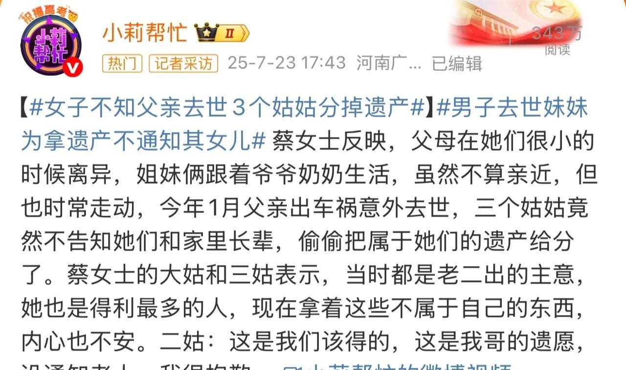 #女子不知父亲去世三个姑姑分掉遗产# 这还是人吗?有这样的亲姑姑吗? 近日,河