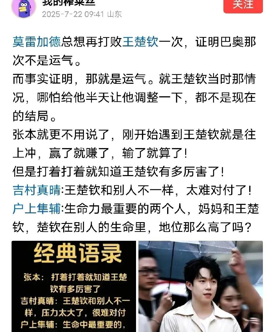 没错,巴黎奥运会上,莫雷加德唯一的那一次战胜王楚钦,当然有运气的成份。 但绝不仅仅只是运气! ——如果你知道在巴黎那场比赛中,雨果是梦碎谁手。 雨果是什么实力,世界杯之后大家也都看到了,自不必多说。 巴黎奥运会半决赛,莫雷加德对战雨果,一个是大赛黑马型,一个常年世排前六的实力稳定型。 第一局,莫雷加德在4-10落后于雨果、在这一局几乎看不到任何希望的情况下,他竟连追8分,最后12-10逆境翻盘雨果! 能想象吗各位? 从4-10雨果大比分拿到局点,到12比10,雨果只要再拿下1分,他就可以拿下这一盘。 后面所有的局势,一定会不一样! 也许,雨果顺势拿下后面两局进入了决赛,搏一搏,单车变了摩托,南美这块百年来的乒乓荒漠里,也许就诞生了第一位奥运单打冠军呢! 要知道半年前,他也是4-2战胜过樊振东的。 当然,他大概率也是赢不了樊振东的,但若拿下银牌,也是创造了巴西乒乓球的奇迹。 没有如果,只有结果。 面对大赛爆种的黑马小莫,雨果1分也没有拿到,小莫在他手里连得8分! 结果就是,后面的比赛雨果一泄千里、道心破碎。 他不仅输了这场半决赛,就连铜牌赛也被主场作战的小布短短30分钟打了个0-4。 巴黎,最失意的不止是王楚钦,还有雨果,他真的太惨了,所以我们看到了他在墙角用白毛巾捂着脸哭得很伤心,他实力和排名都明明白白在小莫之上! 并且就和王楚钦一样,巴黎之后雨果消沉了更久,赛场上人尽可欺、要丝不活的。 直到世界杯。 写这一段并不是说要讽刺谁,只是不赞成图片中这位网友说的“小莫战胜王楚钦就是运气”。 这个世上,每个人能顶住的压力是不一样的,爆发力也是不一样的。 有的选手越到大赛越紧张、越怕输,这是正常的。 但也有的选手,他越到大赛越兴奋、越敢拼敢赢,两相对比之下,临场发挥就天差地别。 小莫的“大赛疯马体质”,其实早在21年休斯顿世锦赛,就已经验证过了。 各种因素之下,巴黎那一次小莫战胜了王楚钦,有运气成份,但不能否定 他个人一定的心理素质、能力和爆发力。 如果他没有这些能力作依托,运气来了,他也根本接不住! 一个平时能力85分的学生,可能某一次发挥极好,考了99分。 但这种情况,大概率是不会发生在平时60分的学生身上的,60分意味着你有很多漏洞,搏一搏,能考到85分,但你很难考到99分。 这也让我想到18年足球世界杯,实力并不那么强的克罗地亚队,赛前没有人看好他们,但是他们运气还不错,小组赛面对的对手不算太强,出线以后,一次次凭借着中场的调度和顽强的意志把比赛拖到加时,多次靠点球大战,竟一步步走到了决赛。 有运气的成份吗?当然有。 但是如果没有自己的坚韧、顽强的意志,只靠运气是万万无法走到决赛的。 技术是能力、战术是能力、心态是能力、意志更是能力! 巴黎那一战,小莫对雨果的第一局,在那种希望渺茫的情况下他没有放弃,一分一分追,连追8分,逆境翻盘。 让我看到了小莫的心态和意志的强大,命悬一线的时候,这比能力更可怕! 但即使和盘托出、即使发挥到极致,99分之后那另外的1分,是属于真学霸的。 所以,极致疯批的小莫和张本过不了樊振东。 所以,倾尽全力、令人热泪盈眶的克罗地亚人,他们也没能战胜法国队。 但是,他们已经是奇迹了!