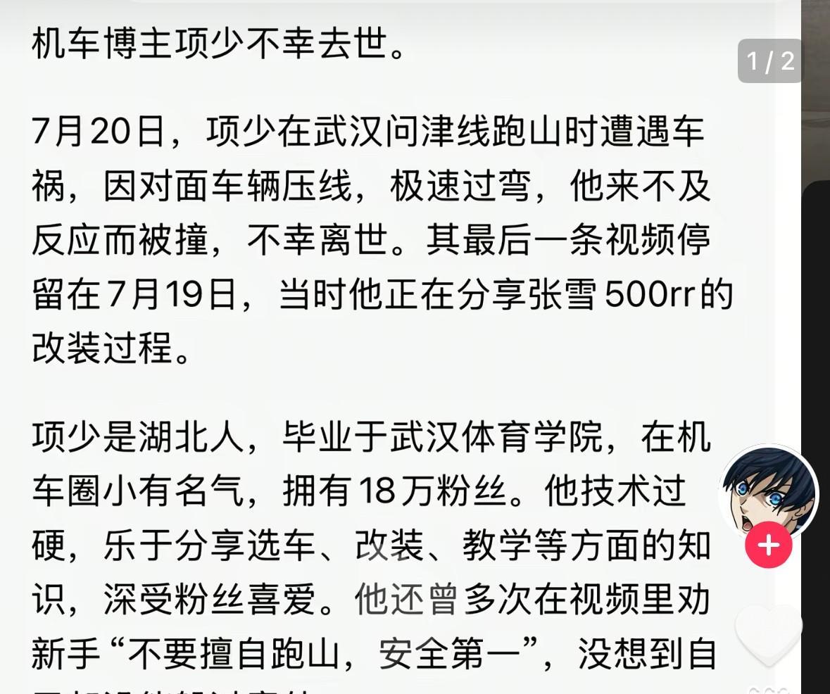 无比悲痛![可怜]知名机车博主“项少”被大货车撞倒身亡,他上个月才刚提的新车,还没有来得及多骑上几圈,悲剧就发生了。 更让人心酸的是,他妻子的肚子里还怀着二胎宝宝。 这位叫“项少”的博主是湖北人,他非常热衷机车,在机车圈小有名气。平日里他喜欢在社交平台上发布一些测评机车以及安全科普的的视频。因为经验较为丰富,有很多粉丝会找他帮忙选车,其账号也积累了19万粉丝。 6月12日,他发布了一个自己喜提新车的视频。当时,他整个人非常开心,毕竟也算是完成了他自己的一个小小心愿。从他的作品来看,项少是一个热心的人,因为在上个月的6月16日,他还去到了一家儿童福利院,捐献了5000元的爱心款。 他的账号内容停留在了7月19日,当天,他还在线上分享了车子的改装视频。只是,谁也想不到,仅仅过去了一天时间,他的生命便不在了! 悲剧发生在7月20日,根据知情人提供的信息,事情大概是这么一回事: 那天,项少骑着自己的新车行驶在武汉问津线。突然,对向一辆大货车压线极速驶来,由于速度都很快,项少来不及做出反应被撞不幸去世! 他是95年出生的,今年满打满算才三十岁。几年前,他和妻子生育了一个儿子,现在妻子肚子里又怀了二胎。如果不出意外,几个月后他就又当爸爸了…… 然而,很多事情总是事与愿违。他曾多次在视频里劝诫新手不要盲目跑山,要以安全为重!结果,他自己却没能躲过意外! 在此,真的心疼他的家人,让人更心酸的是,那个还没有出生的小宝贝此生再也没有机会见到自己的父亲! 现在,悲剧已发生,留下的只有亲人无尽的悲痛![泣不成声][泣不成声][泣不成声]在这个事情里,更难的是他的妻子,她不仅年纪轻轻就失去了丈夫,未来还要独自抚养两个孩子……[祈祷]