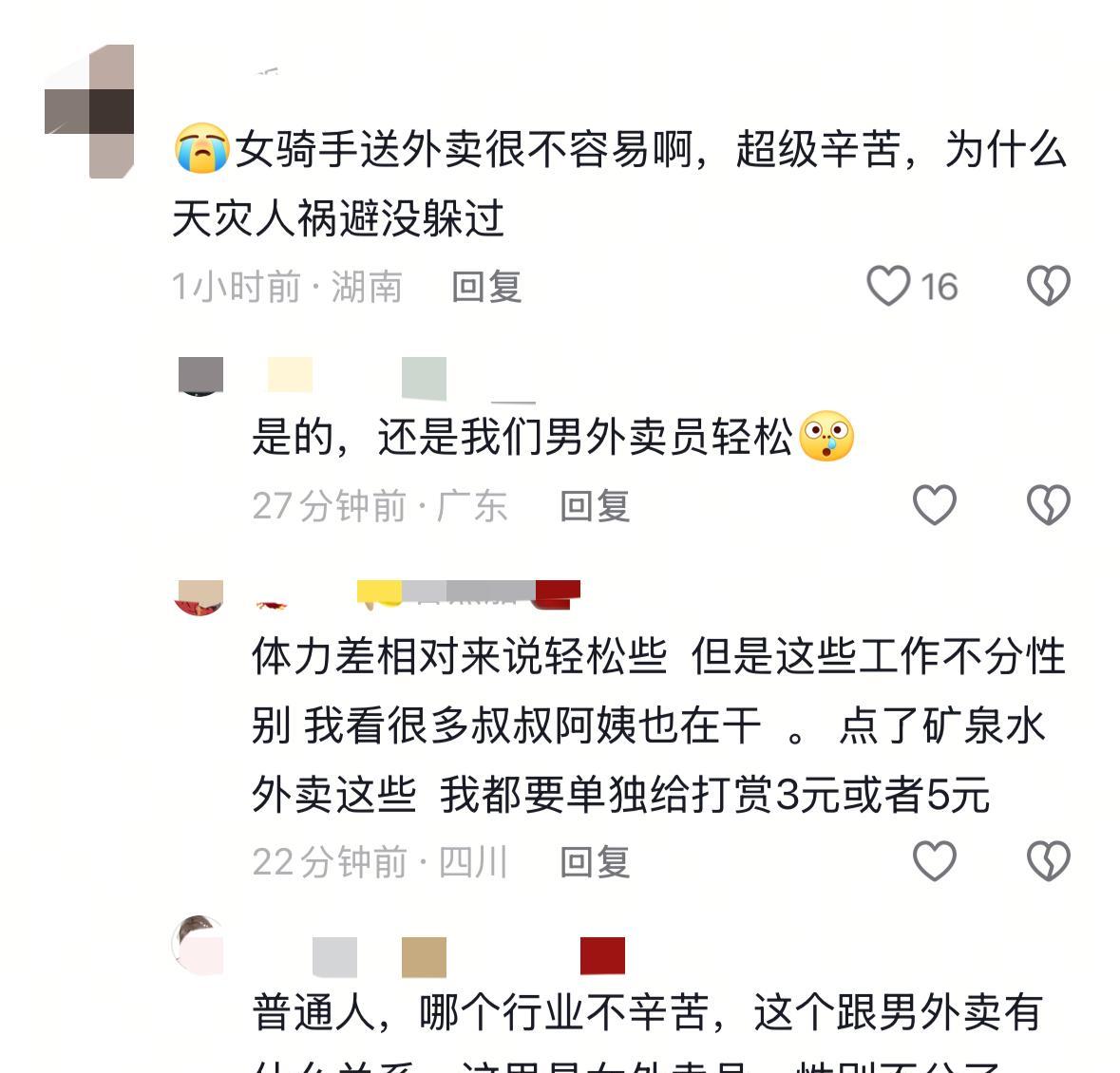 命运的旅途会有各种意外和不幸,穷人有穷人的幸福,富人有富人的烦恼,事实上每个人都在努力谋生竭尽全力的活着为了活得更精彩。不能因为她是一个女性,就质疑她送外卖就是吃苦,那广大男性从事种种脏乱差的工作就是享福理所当然了?