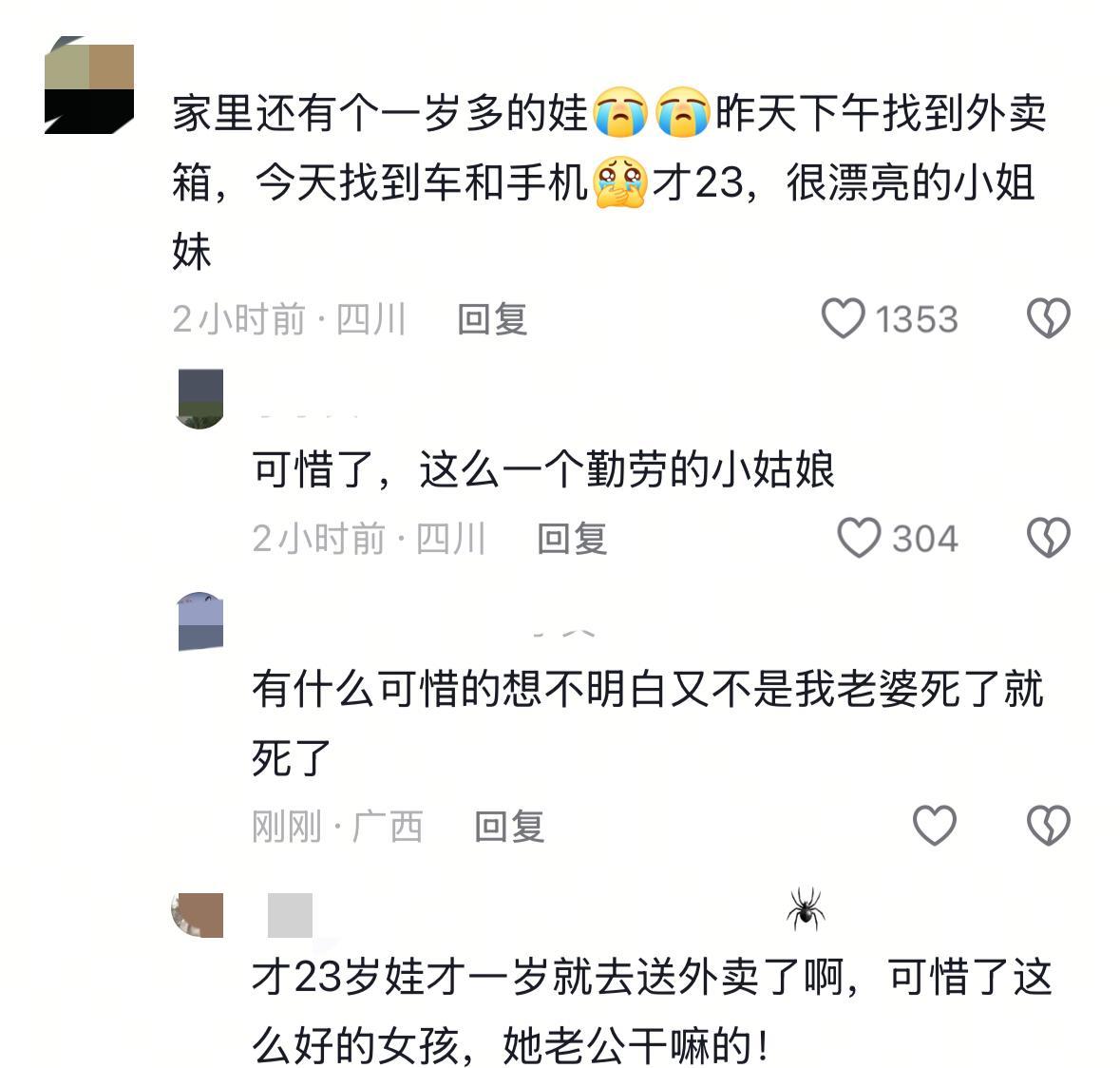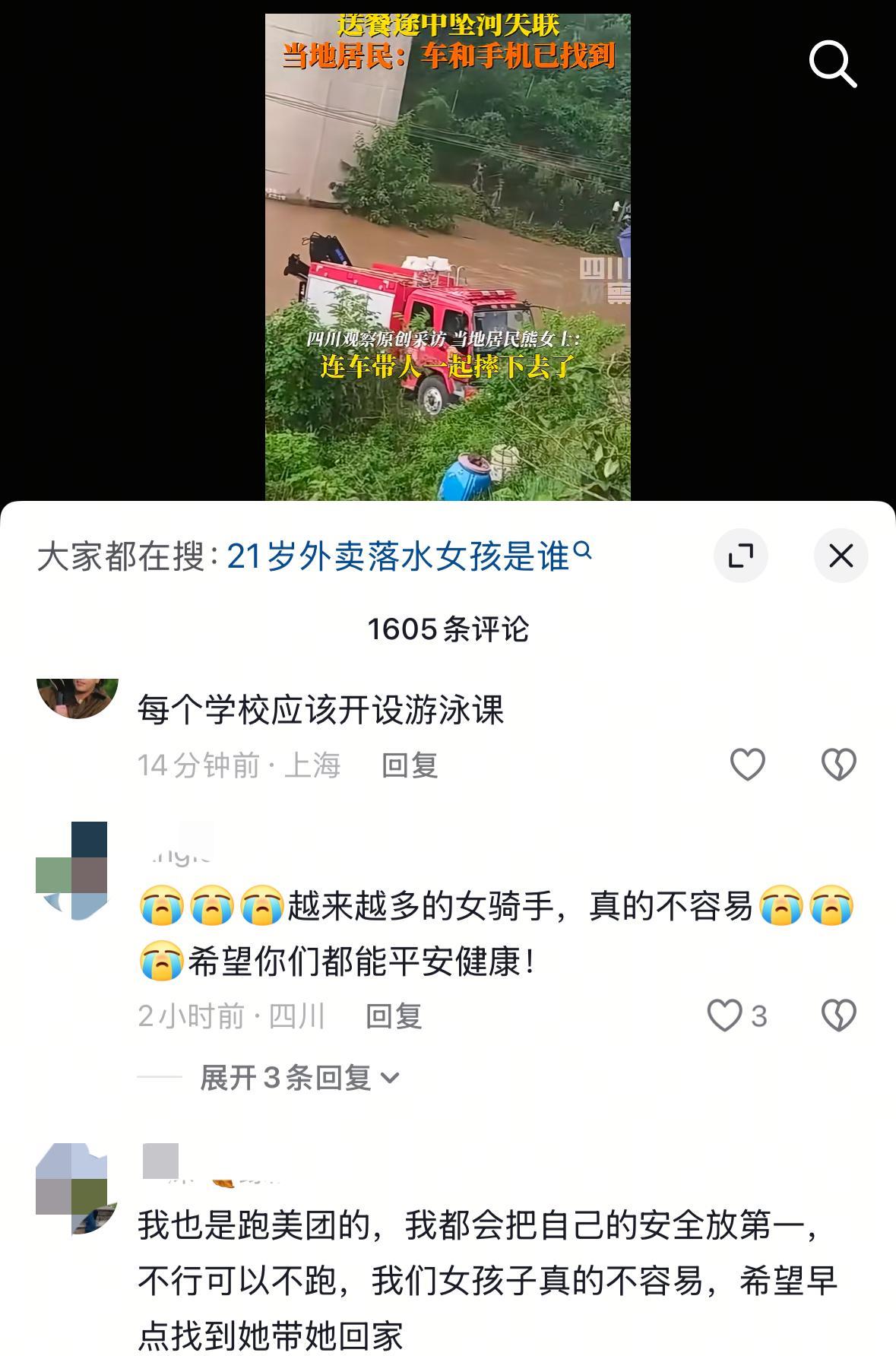 泪目![流泪]四川坠河的21岁女外卖员长相很漂亮,她的孩子还不到2岁。邻居们说她是为了多赚点补贴家用,才在上个月开始跑外卖。 悲剧是7月23日发生的,事情的经过大概如下: 当天,女子照样早早的起来了工作,上午九、十点的时候,她接了一个订单。由于下雨天气河水暴涨,连桥上都已经漫了水。而她手里的那笔单子,恰好就得从桥上过去。 女孩在骑车过桥的时候,不慎连人带车掉进了水中。经过救援人员的全力搜救,她的车和手机都被找到了。遗憾的是两天时间过去了,她人至今不知所踪。 坦白说,看到这个事情心里真的特别难过!她才21岁啊,长得既甜美又漂亮,结果却活得这么辛苦。在本该上大学的年纪,就已经被迫承担起了生活的重担。不仅成为了一个年轻妈妈,也成了一个风里来雨里去的外卖员。 但凡她家里条件好点,她也可以在家里舒舒服服的吹着空调。可是很多时候,人是身不由己的。 通过这个悲剧,希望大家可以明白一点:生命无价!赚钱固然重要,但无论如何都一定要以自身安全为重!在关键时候,哪怕亏一点钱财,只要人平平安安的就是赚到了! 这个女子终究是可惜了,如今,发生了这样的悲剧,她的爸爸妈妈该有多么难过啊?[流泪][祈祷][祈祷]在此,真的希望她只是被好心救了,暂时没有同外界联系,过个两天就可以平安回家!