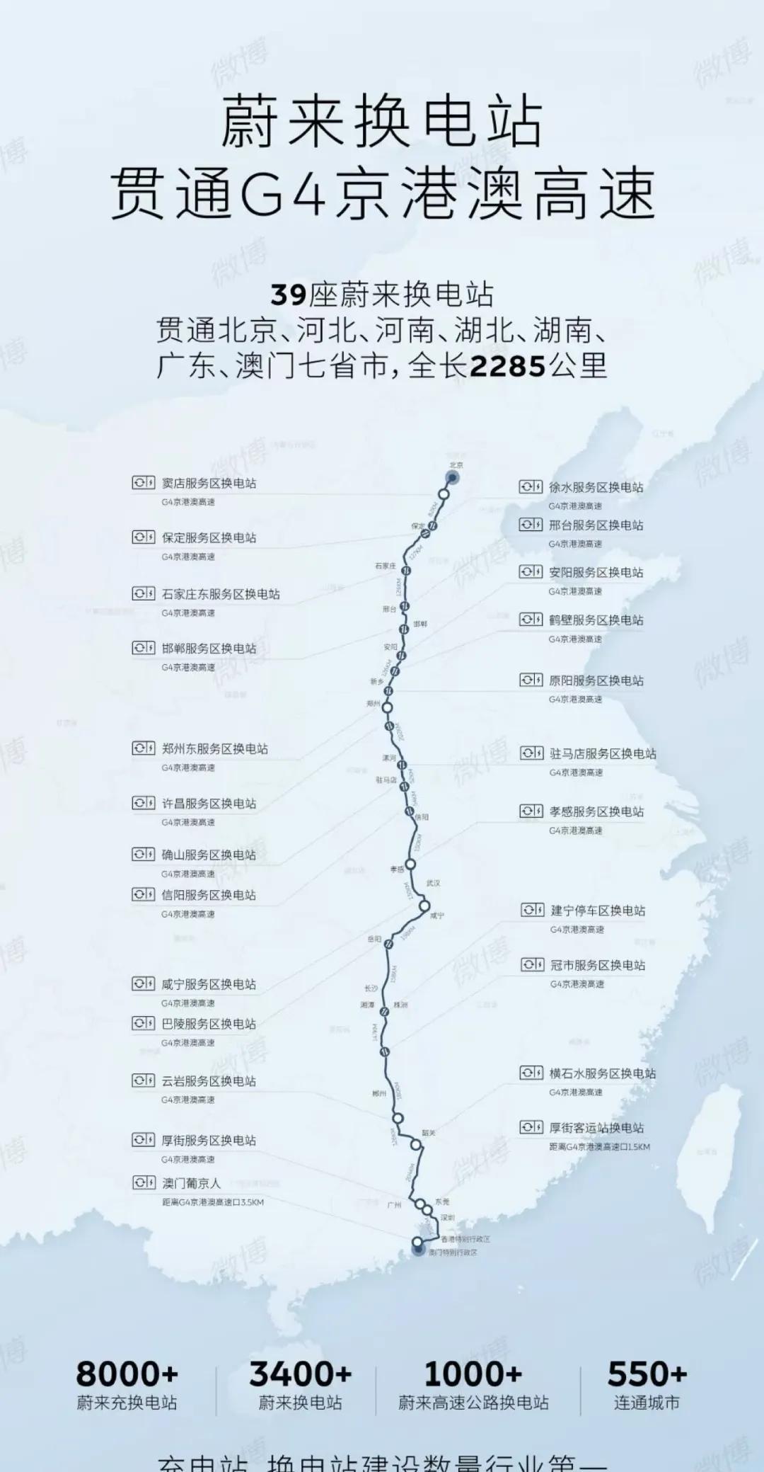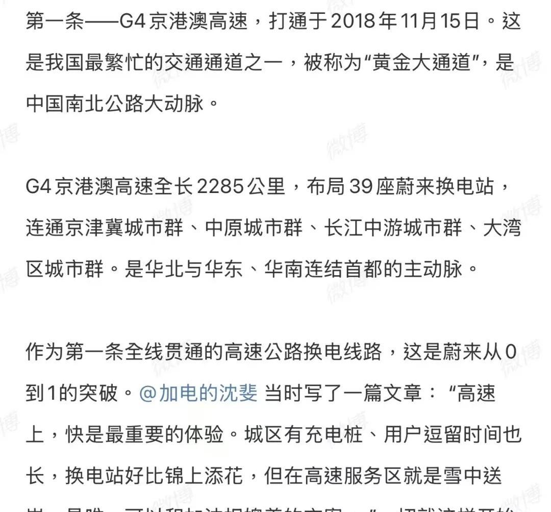 理想把蔚来逼急了,李斌要展示蔚来的实力 李想发了微博,说他们九纵九横高速充电桩已经无敌,自称第一,一点也没把蔚来放眼里。 李斌说,来大家看看蔚来9纵11横1001座高速换电网络的震撼吧。看看是理想的充电桩好用还是换电站好用? 于是理想蔚来的充电桩与换电站之争就开启了。 今天李斌先介绍第一条高速,G4京港澳高速,全长2285公里,有39座换电站。后续还有19天,李斌继续介绍其他高速换电站。 (注:图片素材源于网络,文字内容全原创) #蔚来 #新能源发展 #理想
