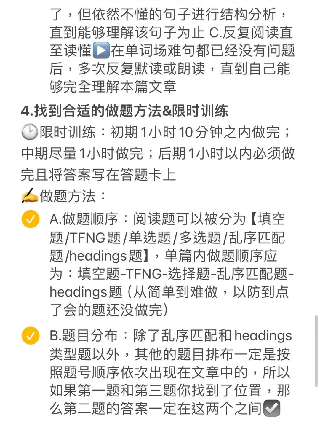 4.限时训练&找到做题技巧:限时1h训练,做题顺序参考-填空题-选择题-TFNG题-乱序匹配题-headings