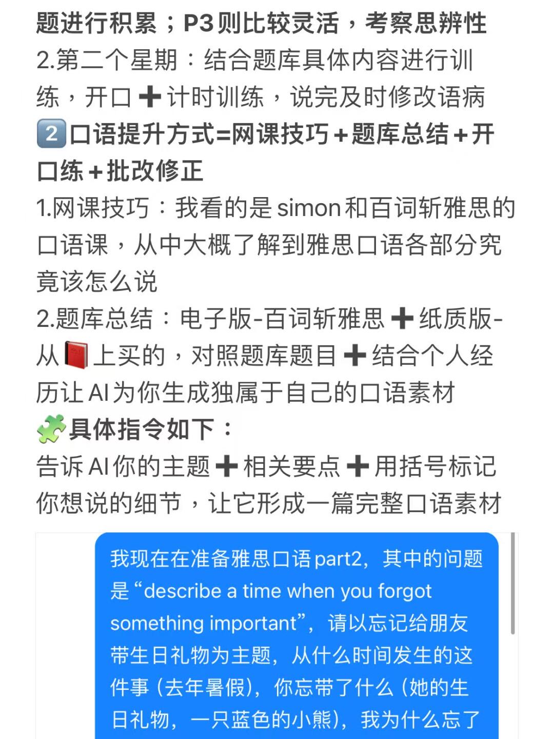 2.题库积累:以百词斩雅思的题库为基础,按题库的顺序结合自身经历让AI生成回答(AI指令见图中所讲)