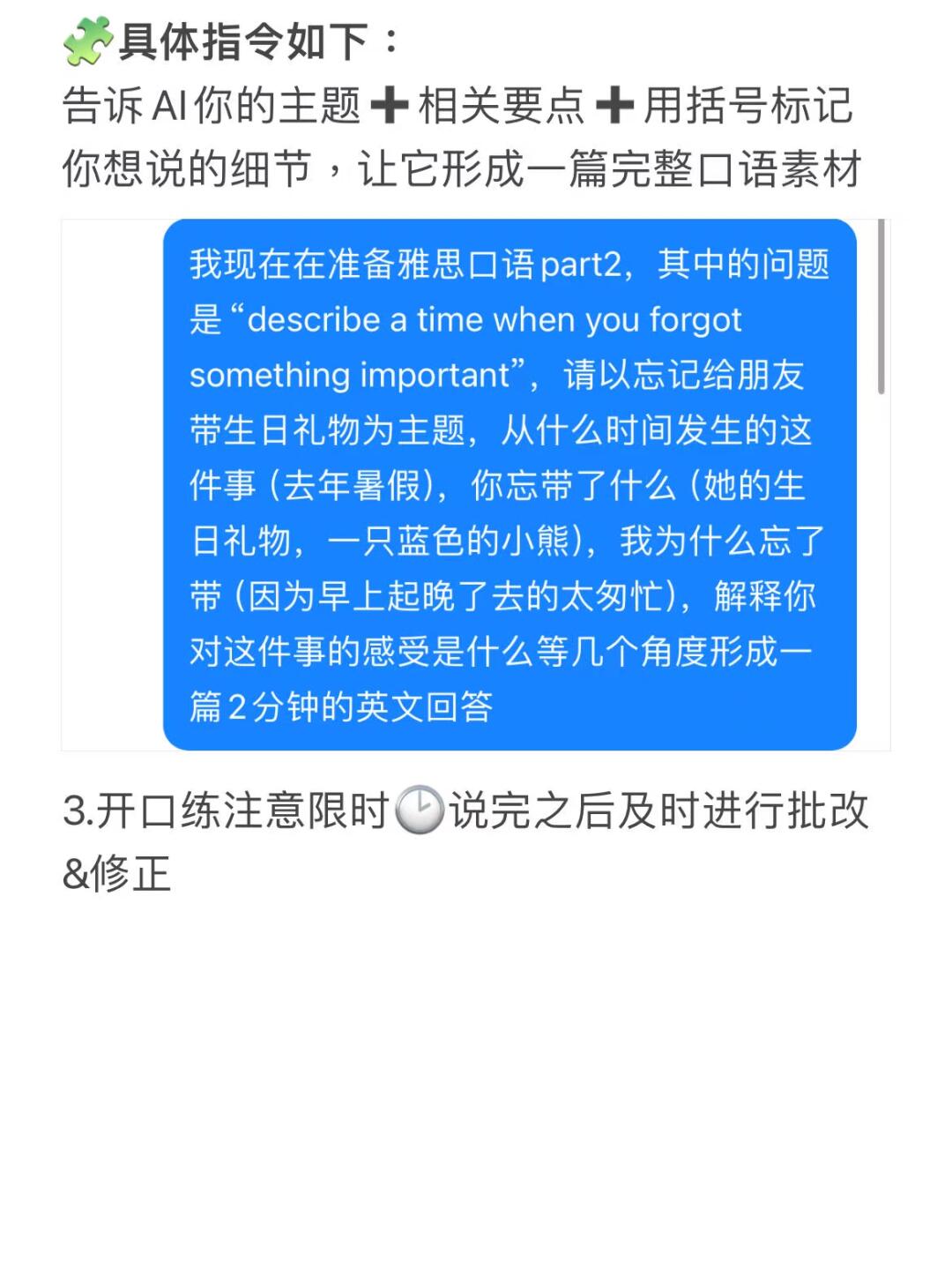 🧩可以按照口语训练的指令进行口语表达和训练,先开口说再进行积累,最后再针对你的想法进行批改修正!