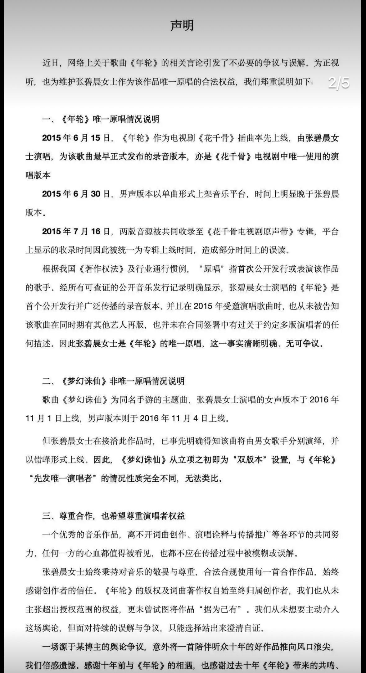 多读书还是有用的![抠鼻]张碧晨工作室发的声明是典型的失败公关,把原本一件不值一提的小事硬生生放大了。 原本,张碧晨作为一个知名歌手,对于网红旺仔小乔的不当言论大可以置之不理。毕竟,对方和她完全不是一个级别的。 汪苏泷作为被旺仔小乔忽视的一方,他还没说啥,张碧晨一方却发了一个不痛不痒的声明,标注自己为独原唱。 在此,真的不知道她团队是怎么想的?[what]那歌只是汪苏泷授权给她唱的,打个最简单的比方,就是人家把一个新东西借给她使用而已,按照规定对方是可以随时收回的。 结果,她们一方却像是忘记了这个“约定”。 事实上,汪苏泷才是《年轮》唯一的原创作者。当初,随着电视剧的火爆这首歌也很快火了起来。当时,就有很多人知道这首歌的词曲、版权都在汪苏泷身上。这点,张碧晨又不是不知情,毕竟二人曾经还多次同台合唱过这首歌啊! 如此一来,张碧晨一方,真的太不给汪苏泷面子了,也不怪人家反手就收回版权了。汪苏泷一方能做到什么话都不说,直接收回授权,已经是给其天大的面子了。 这首歌都十来年了,张碧晨虽有不少代表作,但不得说《年轮》是她最为著名的歌曲之一!在她演唱生涯里,这首歌传唱率很高。然而,现在她连唱的机会都没有了…… 如果当时可以幽默的回应一句,感谢汪苏泷,并肯定他为双原创,结局一定是皆大欢喜啊!
