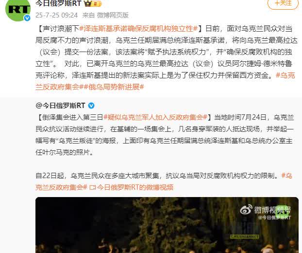 乌克兰民众抗议活动第三天,继续进行中,在基辅的一场集会上,几名身穿军装的人抵达现场,并举起一幅写有“乌克兰叛徒”的海报,上面印有乌克兰任期届满总统泽连斯基和乌总统办公室主任叶尔马克的照片。 泽连斯基遭遇的这场政治危机,是开战以来最要命的。 闹到第三天,越来越不简单,穿军装的人下场,明摆着军中有不满,泽连斯基这次真坐不住了。 限制反腐败机构权力只是导火索,底下全是烂账,国内老百姓早对战争拖得没头没尾、日子变苦有意见,再听说不少援助款被层层扒皮,谁能不火大? 泽连斯基以前跟特朗普打交道就没拎清,穿军装进白宫、矿产谈判出尔反尔,早把人得罪透了,欧洲一堆援助砸进去,眼睁睁看着被贪腐吞了,现在反腐败机构还被限制,换谁能忍?这哪是援助乌克兰,分明是给蛀虫送钱,美欧能不失望? 泽连斯基这两年有点飘了,仗着西方援助就高枕无忧,精力全放攥紧权力上,连停火谈判都阳奉阴违,生怕丢了总统宝座,可他忘了,权力靠美欧输血和国内支持撑着,现在两边都得罪光了,不闹才怪。 说不定是美欧觉得泽连斯基没用了,想换个听话的代理人。西方援助不是白给的,养不熟就换个人喂,很正常。 有人说这可能是泽连斯基下台的前奏,我觉得靠谱,但乌克兰垮台不至于,西方还需要这个棋子牵制俄罗斯,顶多换个新领导人。 泽连斯基识相的话,早点体面退场或许留条后路,不然被赶下台,怕是连老家都回不去。 在国内矛盾炸锅,国外靠山生厌,就算挺过去,权威也没了。接下来看他怎么周旋,不过依我看,难喽,这盘棋怕是要被将死了。
