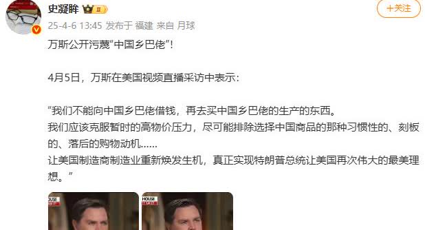 ·“不怪中国,是美国领导人蠢!”公开污蔑中国人“乡巴佬”的美国副总统万斯,这次竟