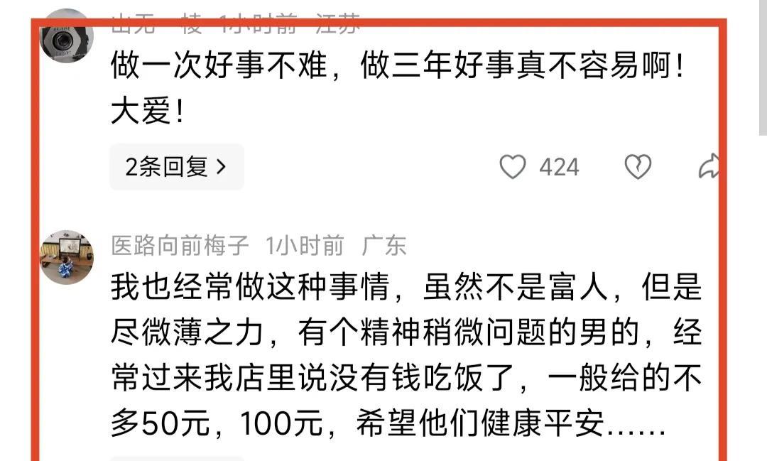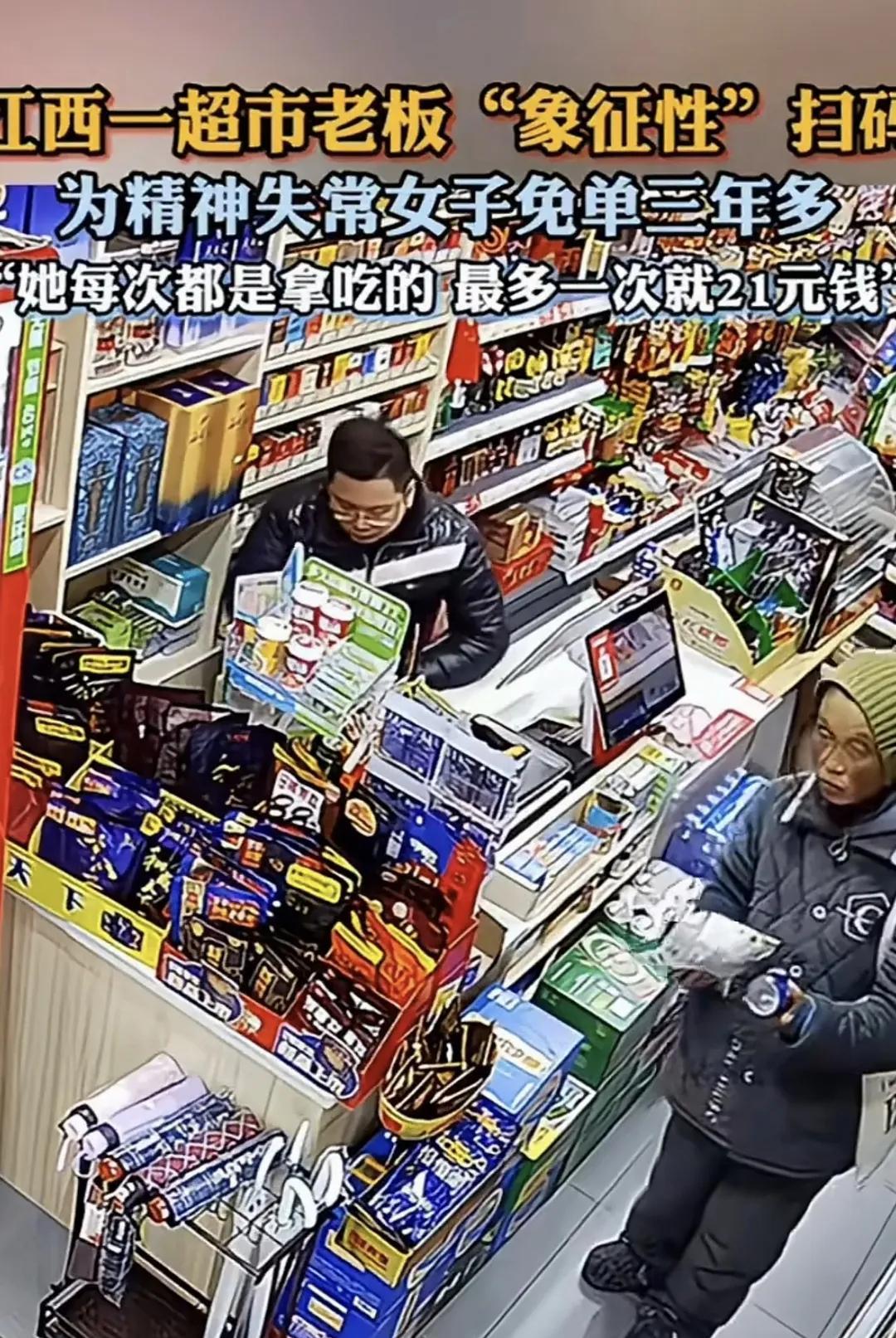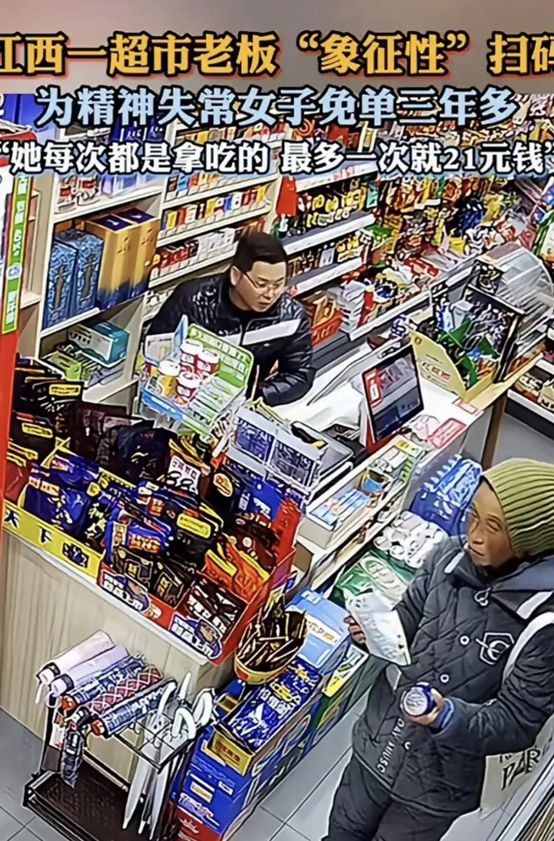 坐着高铁看风光,同时刷到了这一条视频。以前也曾经刷到这个视频,今天有时间,忍不住感慨几句。江西省一超市老板对一位特殊的顾客象征性地扫码三年,没有收过一分钱。这位顾客是一位精神失常的女子,每次到她到超市来主要拿一些吃的,每次十多块钱,最多的一次二十多块钱,三年来,老板都要象征性的进行扫码。虽然每一次钱都不多,但是能坚持三年,其实这笔支出已经不少了,这真的是大爱,真的是骨子里面的善良。这是人世间最美的风景,比高铁窗外的风景更美。其实很多普通人在做着很不普通的事情,好人也很普通。