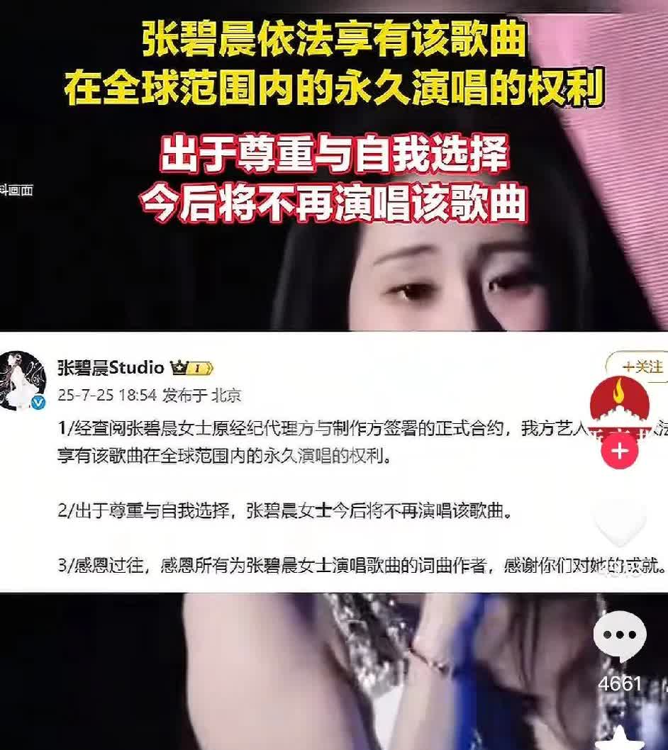张碧晨方声明来了! 张碧晨工作室一开始坚称“唯一原唱”,还晒出时间线证明自己版本先发; 汪苏泷则拿出邮件表明立项就是男女双版本,直接收回授权。 现在张碧晨又声明有永久演唱权,却又决定不再唱。 这事儿告诉我们,在娱乐圈,不管是歌手还是网红,说话做事都得谨慎,一个小失误就能引发大风暴。 歌手签约要看清条款,网红发言也别太随意。 你们觉得,这“唯一原唱”重要吗?