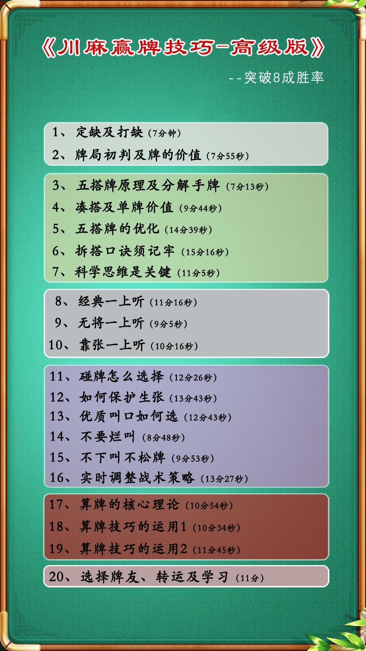双十一优惠!!我的专栏《川麻赢牌技巧》原价468,双十一期间给大家一个优惠价288元。 这个专栏上线以来,已经有超过300人购买,并打出了5分的高分,感谢大家的认可和厚爱。 在这个专栏里面,我结合实战案例详细讲解了麻将的基础及进阶内容,比如: 1、五搭牌原理的高效运用; 2、三大牌型的高效打法; 3、牌局中期的应对策略; 以上这些内容,市面上你很难找到能给你讲得既清楚又详实的课程或者教材,而我的专栏却能兼顾理论和实用,并且在双十一给到大家最优惠的价格。 观看我的专栏提升对麻将的认知,让你告别“十打九输”! 欢迎大家点击下方的“看一看”按钮,把握“双十一”的限时优惠,用超低价订阅我的专栏,相信你看完也会忍不住给我五星好评!