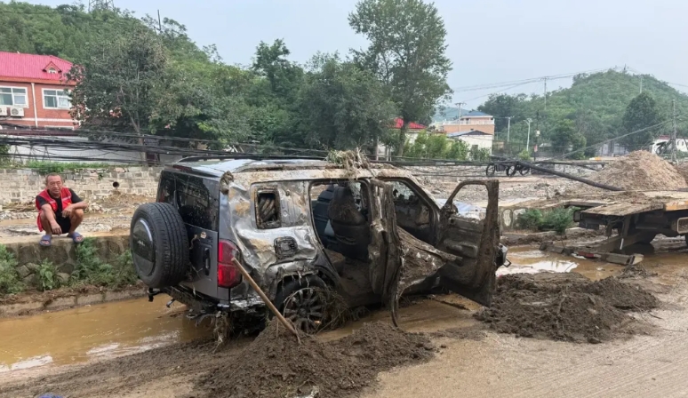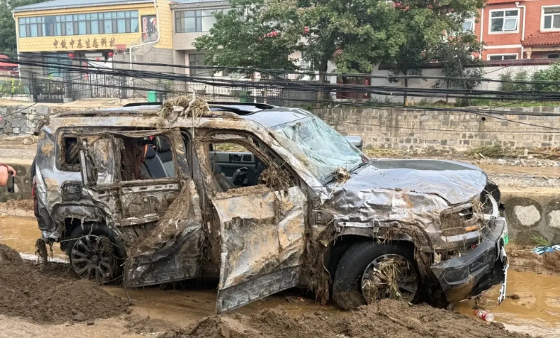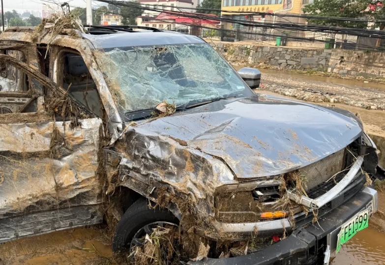 这就是昨天豹5车主出去准备援助别人时候开的车。 经历了大风大浪被大水冲走,碰撞后