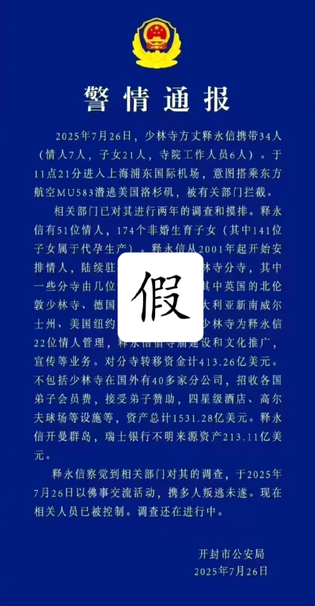 少林寺方丈真的有情人和私生子,但“51个情人,174个私生子,1500多亿美金资产”是假的,有相关违法事实,但数字对不上,而且方丈还涉嫌刑事犯罪!