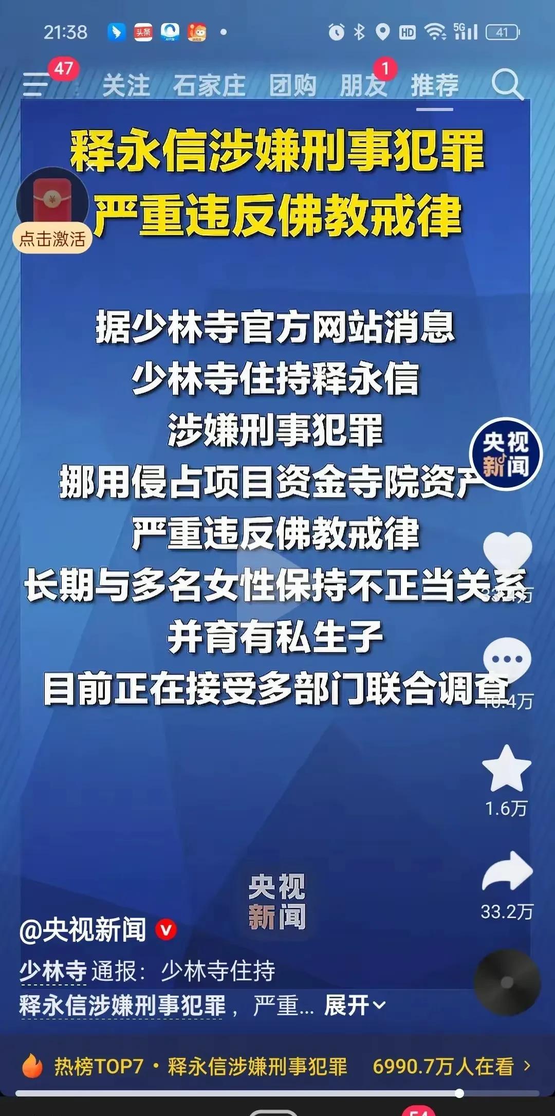 释永信曾被举报存在私情、贪污高香收入以及与女子育有孩子等情况,不过都被他蒙混过关了。 这是十年前的事情了,当时有人罗列出他的七项罪状,很快就有人逐一进行澄清。一夜之间,这七项罪状就沦为谣言。 如今这些罪状又再次浮现,其中一些在通报中还得到了证实。 与女人有染并且育有孩子,这仅仅是道德层面的问题,他最大的问题在于挪用和侵占寺庙资产,如果数额达到1500万以上,他至少要被判处10年以上有期徒刑,甚至无期徒刑乃至死刑。 免责声明:文章的描述过程、图片均来源于网络,此文旨在倡导社会正能量,不存在低俗等不良引导。如涉及版权或者人物侵权问题,请及时联系@英雄拒绝黄昏 @英雄拒绝黄昏之廖志伟 ,我们将第一时间删除内容!如有事件存疑部分,联系后会即刻删除或修改。