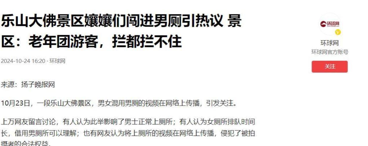 “必须严惩!”2024 年,四川乐山景区内突发尴尬一幕。一男子正在男厕所方便,冷不丁闯进几位大妈,男子被看光,慌乱提上裤子逃离。可出了男厕,门口竟排着长队,放眼望去全是女性,男子愤而拍下视频传到网上,瞬间引发网友热议。 在人多的地方,上厕所确实是一件非常令人头疼的事,尤其是女厕所,厕所门口排队等待的队伍能排老长。 2024年,在四川乐山的一个景区,游客也非常多,当时一位大妈就是在排队上厕所时,实在憋不住了,着急之下就看到男厕所没什么人,就直接冲进去解决生理问题。 可男厕所有小便池,结果就撞上了一男子正在小便,突然看到一大妈冲进来吓得赶紧提上裤子,还大声的告诉大妈:“你进错厕所里,这里是男厕所!” 怎知大妈不管不顾的就去蹲坑上厕所,丝毫不在意这里是男厕还是女厕,而男子则赶紧离开了卫生间,然后就看到了男厕所门口排队的竟然都是女性。 男子不敢相信,仔细抬头看了看男厕所门口的性别指示牌,确认自己没走错,等看到女厕也是排了好长的队伍男子才反应过来,心想,这是等不及了,就不管男女之别了? 原来,在排队的女性队伍里,有人看到大妈去了男厕,就有样学样跟着去了,这一下便打破了原本的秩序,让更多人觉得 “法不责众”,纷纷效仿着往男厕里挤,现场顿时乱成一团。 一气之下,他拍下视频传到网上,瞬间引发轩然大波。 乐山大佛景区工作人员回应,当时是老年团刚到停车场,大妈们坐了太久车,扎堆上厕所,现场管理员拦都拦不住,才出现这尴尬一幕。这事儿一曝光,网友们吵翻了天。 网友认为,女性进入男厕所,严重侵犯了男性的隐私和权利,让正在如厕的男士情何以堪,有人甚至调侃,男士在厕所上厕所时,突然被女生撞见这样还如何尿得出来! 但也有网友表示理解,毕竟在很多公共场所,女厕所排队是常态,女性因生理结构原因,上厕所耗时久、需求大,遇到这种情况,也实属无奈。 还有网友对拍摄视频的行为提出质疑,觉得拍摄和传播可能侵犯了被拍摄者的权益。 其实第一个大妈闯进男厕,或许是急得没了办法,可后面人跟着学样,多少带着点 “法不责众” 的心思 —— 反正有人开了头,大家一起 “破例”,好像就没那么扎眼了,这种群体里的模仿心理,就像排队时有人往前凑,后面总有人跟着动。 不过话说回来,要是景区能多些灵活的 “应急厕位”,或许大家也犯不着在这事上纠结,毕竟谁也不想在大佛眼皮子底下,上演这么出哭笑不得的闹剧不是? 对此,你怎么看?