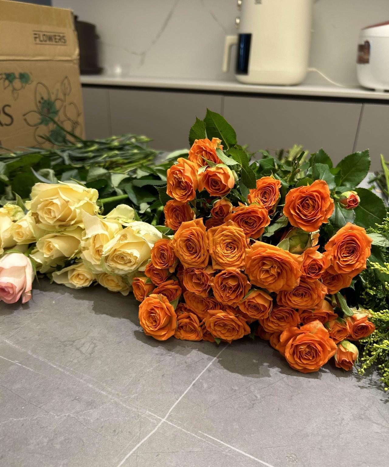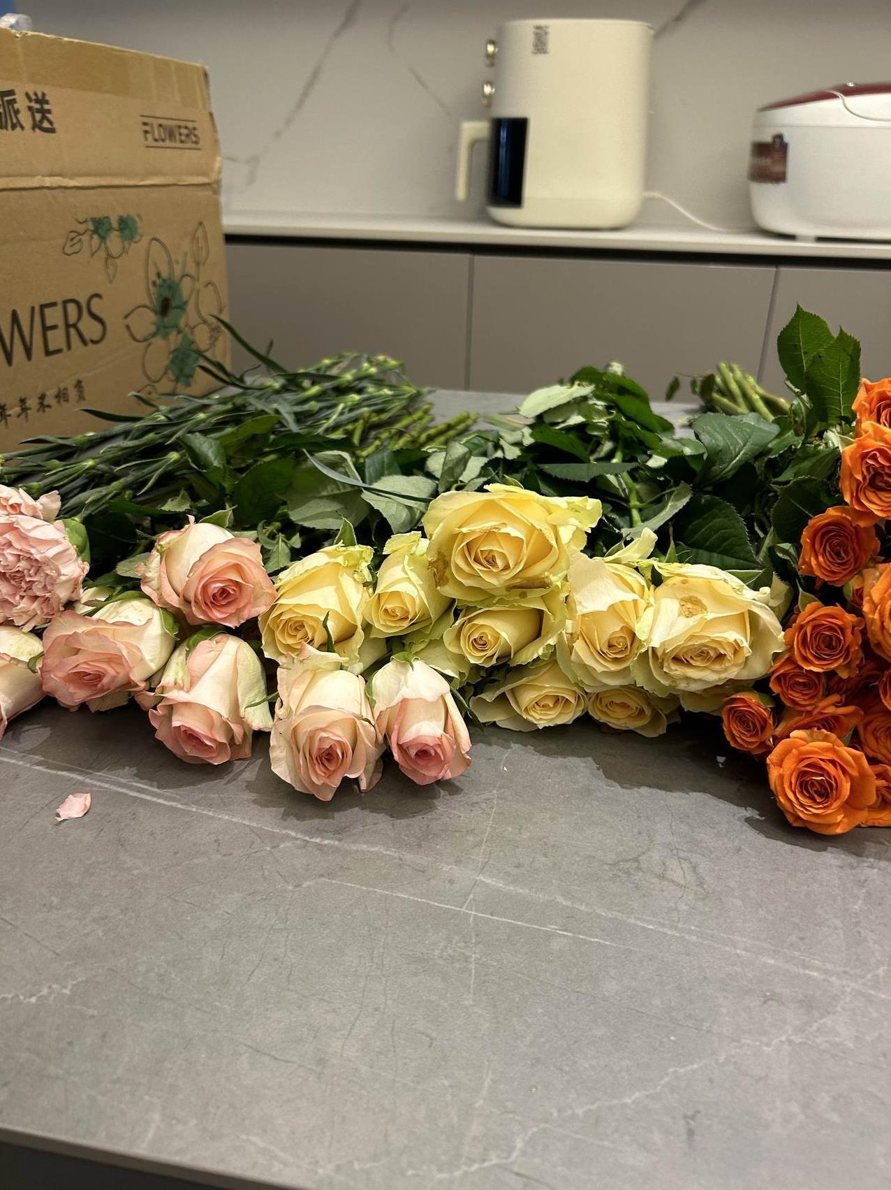 今天的幸福,是明码标价的, 一单29.9,一单18.8, 加起来48.7大元。 刚收到花,有点惊喜, 沉甸甸的一大箱, 心说:好实惠的卖家! 打开才知道, 买的永远没有卖的精, 这句话是真理! 各色玫瑰里面,有一半是有毛病的, 外面一层花瓣, 明显有褐色的晕染, 预示着已经枯萎的开始。。。 一根根的打掉叶子, 只保留饱满鲜艳的花朵, 大大的醒花桶里面, 居然依然塞的满满当当。。。 48.7元的鲜花, 最终分配给了三个花瓶, 最起码一个星期的时间内, 它们都在温暖着我, 而一天,不过几块钱。。。 女人分两类: 一类是买菜的, 另一类是买完菜, 不忘给自己买束花的。 愿我们都活成后者: 一手执菜,一手捧花。。。[微笑][微笑][微笑] #今天幸福#