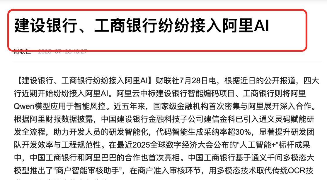 阿里再获“国家队”认可,技术实力有担当,信任更上一层楼! 很多人估计没有注意到,现在很多央国企和机构又纷纷选择了阿里。最近有两件事情传的很广,一是建行的金融科技子公司建信金科引入阿里自研的AI编程模型,用通义灵码写代码。还有就是中国工商银行基于通义千问多模态大模型推出了一个用于商户审核的功能,这个成果还入选2025年北京市人工智能赋能行业发展典型案例。 但是更重要的信息是:两大行和阿里合作,这种国家级金融机构跟阿里展开深入合作是对阿里技术比较信赖,证明阿里在硬实力方面绝对够强,也能反映出阿里是值得信任的好同志。 而且这个趋势不仅仅发生在金融领域,除了大行给阿里投出信任票,在很多的重要场合,阿里也是第一选择。 比如2025年春晚,阿里云是云计算AI独家合作伙伴。在整个春节期间,阿里云全球云计算基础设施及AI技术将支持全球华人云上看春晚。春晚和阿里的这次AI技术合作,也是央视总台春晚史上首次引入技术合作伙伴。 现在很多人可能不知道,之前网络购票系统刚出来的时候很容易卡顿、崩溃,后面12306将75%的余票查询功能放到了阿里云上才解决了这个难题。 春晚是全国人民都关注的重要时刻,12306购票系统是人们出行的重要工具、四大行是国有银行,作为金融机构,各个方面都很严格。 但就是这些关键时刻,国家都选择了阿里为技术担当,足以看出对阿里的信任稳固与提升。