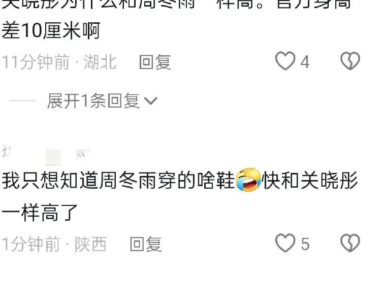 红毯上,身高162厘米的周冬雨居然比身高172厘米的关晓彤还要高一点,网友们看到这一幕后都愣住了,因为在大家的印象里周冬雨的个子在娱乐圈一直都算矮小的,而关晓彤则是大高个的代表,怎么这俩人同框周冬雨的身高能比关晓彤高呢? 于是很多网友特地跑去查了俩人的身高,确定俩人的确相差了10厘米,而且是关晓彤比周冬雨高10厘米。 在身高悬殊这么大的情况下,周冬雨能坐到反超关晓彤,就只有一个办法,那就是穿十几厘米甚至二十厘米的高跟鞋,毕竟走红毯关晓彤也要穿高跟鞋,周冬雨能在关晓彤穿高跟鞋的情况下比关晓彤还高,就只能是她的高跟鞋 很高了,是真正的“恨天高”。 不过关晓彤和周冬雨同框后,大骨架的她居然并没有比周冬雨胖,反而她的脸比周冬雨的脸还小巧,可见最近她在减肥上是真的下足了功夫。
