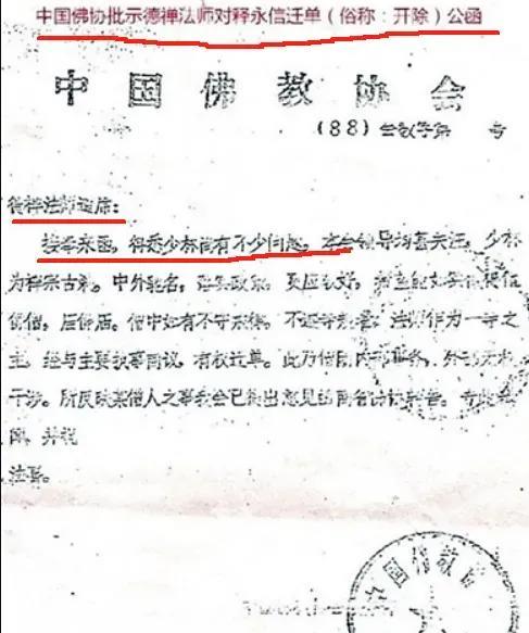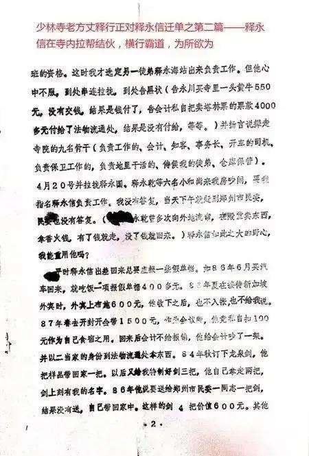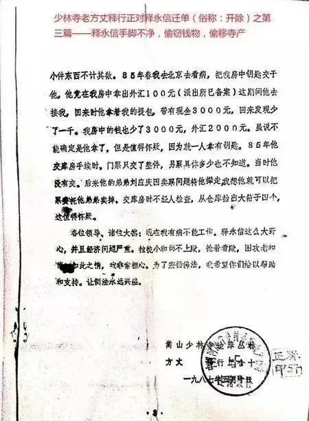 释永信已“迁单”,怎么还能当上方丈,这是一个谜 晚年,释行正方丈就释永信的事情专门写信给中国佛教协会,佛教协会也作了回复,让他们自行处理就可以了,后来,释行正决定对“迁单”,但随着释行正方丈的圆寂,不知何故,他反而当上了方丈 释行正在信中称,在少林寺期间,释永信“偷拿法卷”、“对外接受采访时自称方丈”、“出差虚报假单据”、“以二当家的身份到流通处拿东西”,还有“趁自己去北京看病到房间拿钱”。 1988年,中国佛教协会公函对少林寺相关事件作出回复。随后德禅法师作出释永信迁单的决定。 1988年2月1日,中国佛教协会回应德禅法师,称“寺内如有不守戒律,法师作为一寺之主,经与主要执事商议,有权迁单”,但“此乃僧团内部事务,外部无关干涉”。 这份材料流传很广,释永信的最信任的徒弟释延鲁也证实了这一点。就是这样的一个人,为何就当上了住持呢?这一直是一个谜。关于这一点,释永信应该可以说清楚。 1981年,释永信拜师的时候,应该是很虔诚的,当时师父也喜欢他,对他信任有加,什么事情都交给他去做,他显然成了副方丈,但后来为什么就不喜欢了,或许就是师父在信中提到的吧。 师父的信不知还有没有在中国佛教协会保留,如果有,我认为应揭秘,僧人不妄言不纳金银财宝不偷窃是最基本的,这里随便触犯了哪一条都得“迁单”。 迁单,禅意是开除的意思! (来源:观察网) 免责声明:文章的描述过程、图片均来源于网络,此文旨在倡导社会正能量,不存在低俗等不良引导。如涉及版权或者人物侵权问题,请及时联系 @英雄拒绝黄昏 @英雄拒绝黄昏之廖志伟 ,我们将第一时间删除内容!如有事件存疑部分,联系后会即刻删除或修改。
