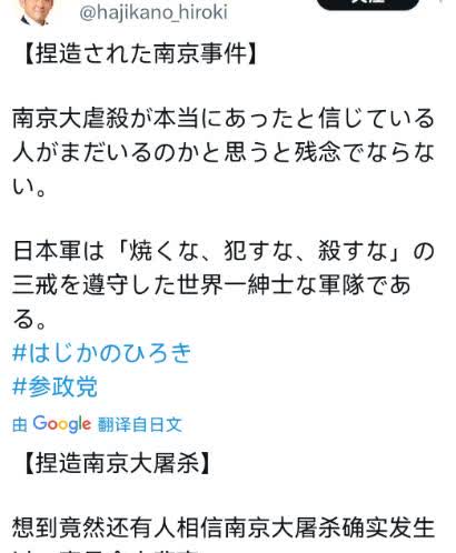 “南京大屠杀是捏造”——日本参议员初鹿野裕树看到《南京照相馆》上映时称,日军是“绅士的军队”。 初鹿野裕树是日本参政党的参议员,他的社媒内容是:“竟然还有人相信南京大屠杀确实发生过,真是令人悲哀。日军是世界上最绅士的军队,恪守‘不烧、不奸、不杀’三戒。” 希望平台不要限流这篇帖子,也希望某些人不要追着“辩论”。 在那里,一个不相信南京大屠杀发生过的人都能成为议员,你觉得以后会不会一个接一个地篡改历史? 别用什么春秋笔法模糊事实,也别想着什么所谓的“营商环境”,南京大屠杀是真实发生过的惨剧,不是什么南京事件!