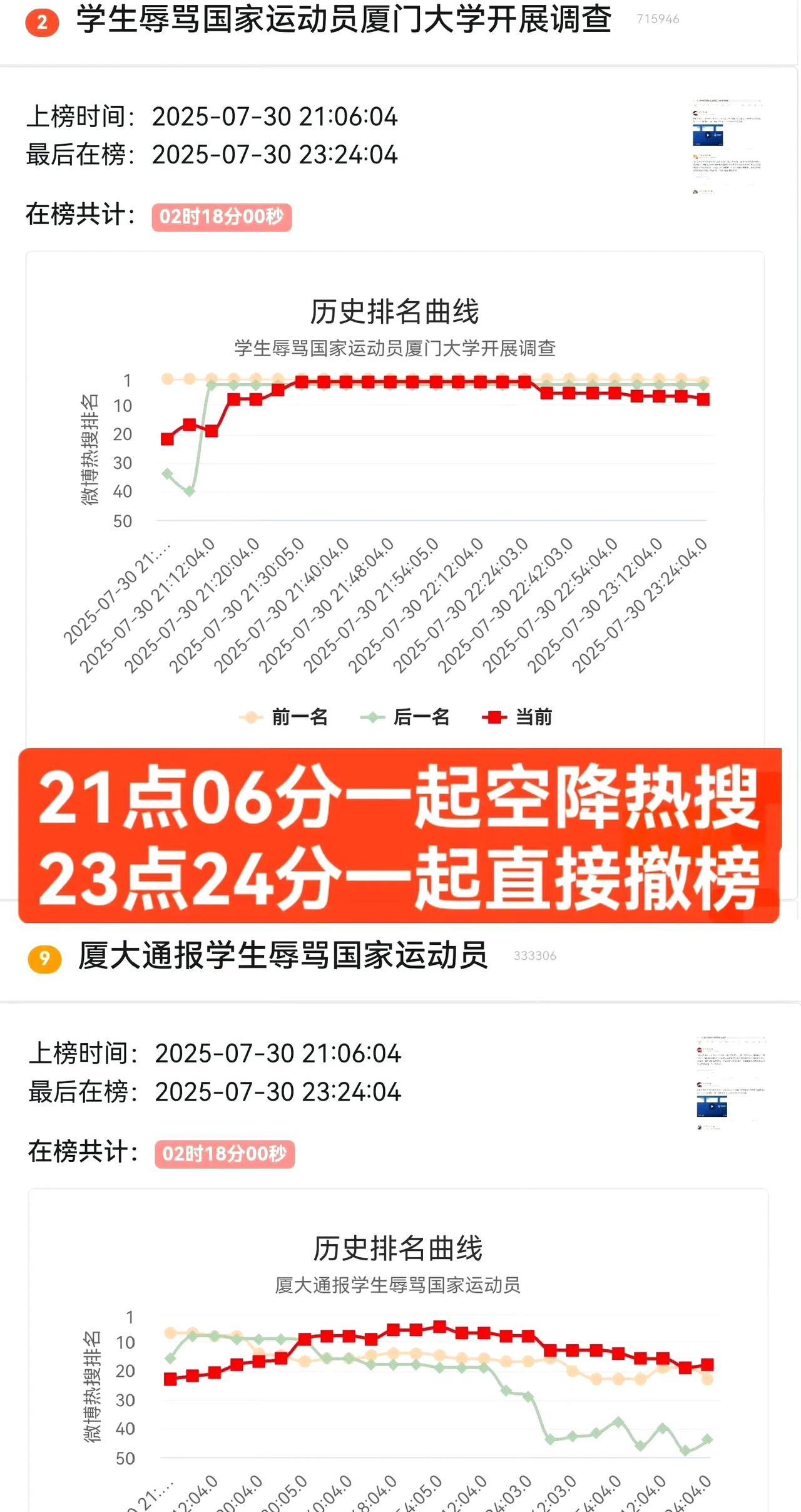 两个话题同一时间上热搜,同一时间下热搜,统一的媒体矩阵再次参与! 第一个话题是:厦门大学对学生辱骂国家运动员开展调查。 第一个话题是:厦门大学通报学生辱骂国家运动员。 这两个话题都与樊振东有关。这两个话题虽然上了热搜,但却再一次再一次让我们看到媒体矩阵出现!随后控不住球迷的反击,这两条热搜又同一时间撤下。 多眼熟的阵容,多熟悉的营销号啊,这些媒体矩阵每次都是一样,到底是谁在背后操作?谁在搞事?谁在主导?幕后指手者一天不抽出来,这些黑色产业链就一天没法清除! 短短四天乒超,媒体矩阵竟然出现两次!而这两次都是沖樊振东而来的,他们这么猖狂,简直就是顶风作案! 这些恶心的利益链群体,迟早总会落网的那一天!