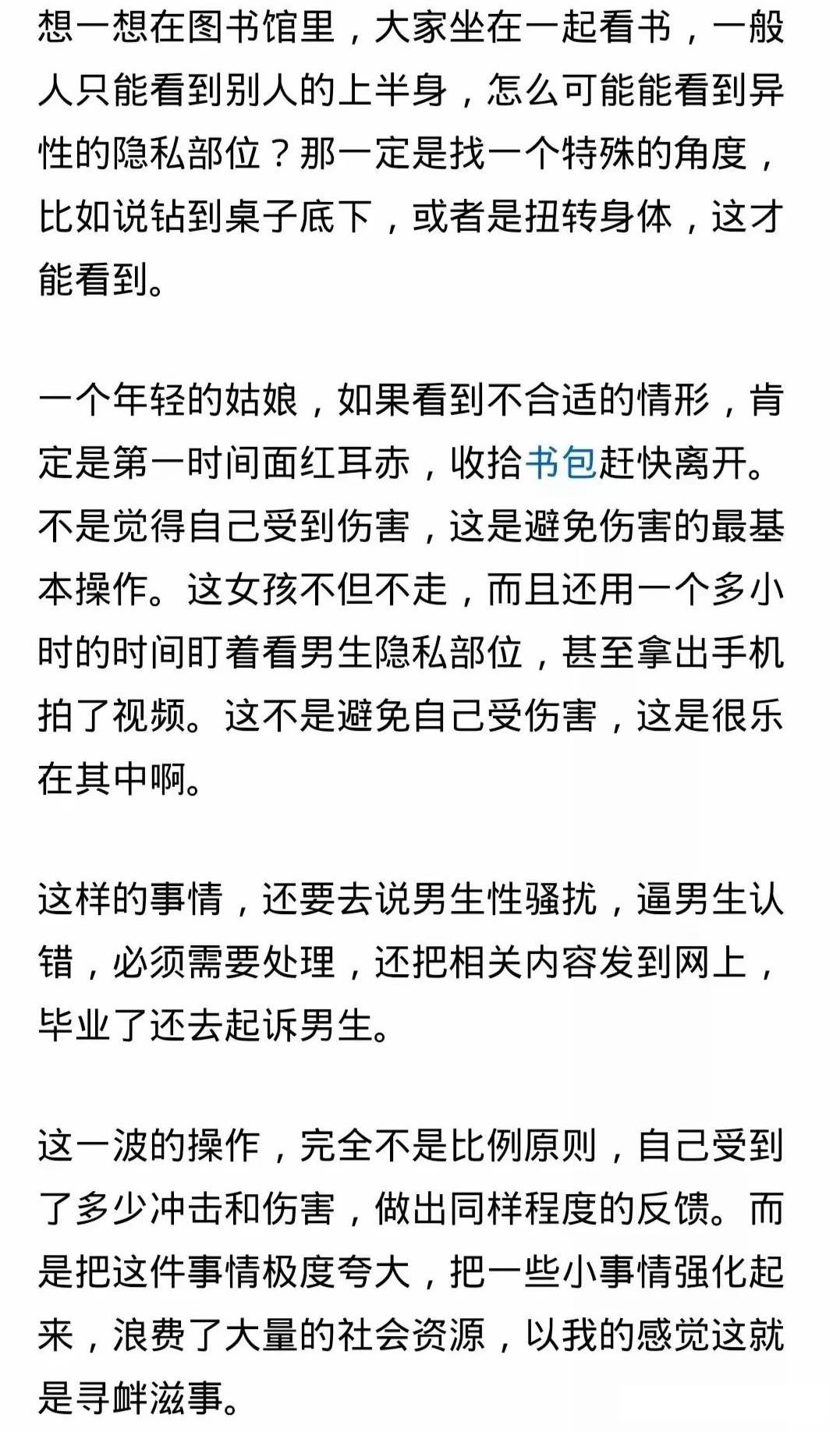 这个男生是武大的,老实本分,胆小怕事,姑且叫武大郎。大郎既没有语言挑逗,又无肢体接触,女孩明知非礼勿视,还要偷窥、偷拍大郎一两个小时,接着往死里陷害,比当年那个潘金莲还歹毒。可怜的大郎,你家要是有个武二郎就好了。二郎办事,既不要什么人居中协调,也不需要等上级指示,简单、快捷、高效。