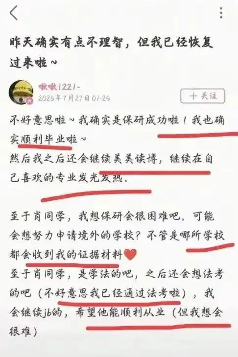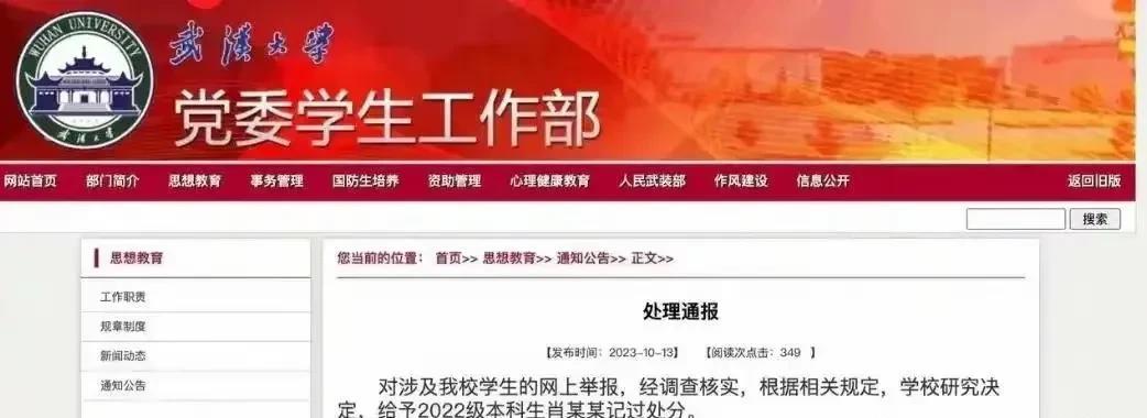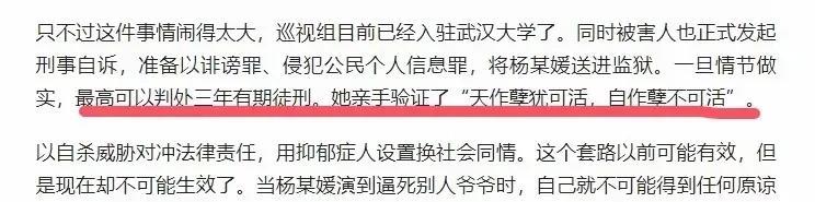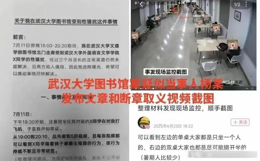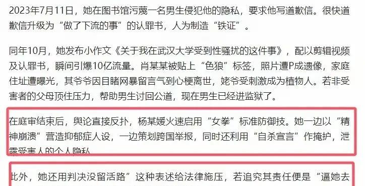 武大“隔空骚扰”事件:人性竟如此恶毒 杨某媛,一名准博士生,朝着对面的肖某猛拍,看到正在挠痒的肖某某便认定是性骚扰,当场大闹起来,肖某某无奈之下写了道歉书。 杨某媛视若珍宝,拿着道歉书到领导处强烈要求处分肖某某。 学校经调查发现,肖同学根本没有“性骚扰”行为,他只是在挠痒罢了。 杨某媛不服气,将此事发布到网上,不明真相的网友们“义愤填膺”地讨伐肖某某,学校也不问是非曲直就处理了肖同学,致使肖某某精神出现问题。 这一事件发生于2023年7月11日。 到了2025年7月25日,事情发生反转,法院判定肖同学并无性骚扰行为。 杨某媛仍不服,嚣张地挑衅,扬言一定要继续上诉,并且晒出自己保博成功来讥讽肖同学。 网友们挖出了杨某媛那“优秀”的硕士论文,发现其中漏洞百出,要求学校处理杨某媛,杨同学精神崩溃。 这是一件很简单的事情,杨某媛因为自己的狂妄与执拗,把自己绕了进去,典型的害人害己。 真相大白,媒体、知名人士纷纷要求武大撤销对杨同学的处分,以正学校的严谨! 截止8月1日8点48分肖同学的处分还挂在网上。 对此,网友很希望! 武大“隔空骚扰”事件,最终两俱伤! 免责声明:文章的描述过程、图片均来源于网络,此文旨在倡导社会正能量,不存在低俗等不良引导。如涉及版权或者人物侵权问题,请及时联系 @英雄拒绝黄昏 @英雄拒绝黄昏之廖志伟 ,我们将第一时间删除内容!如有事件存疑部分,联系后会即刻删除或修改。 #武大性骚扰案# #武大诬告案# #武大诬陷案# #武大冲突# #湖北高校事件# #武汉性骚扰#