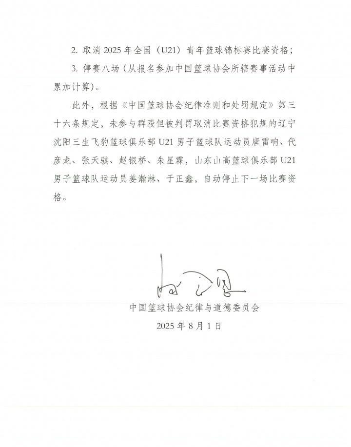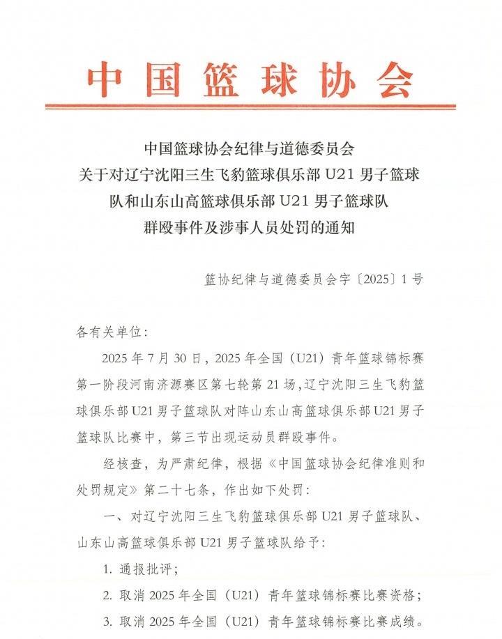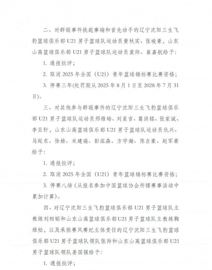 辽鲁U21大规模冲突:黄秋实、张峻豪、袁帅&崔嘉航被停赛三年 中国篮协对日前U21男篮辽宁与山东的大规模冲突事件做出处罚决定,4名球员遭停赛三年,13名球员被禁赛八场。 处罚如下: 黄秋实、张峻豪(辽宁)、袁帅和崔嘉航(山东)被通报批评、取消2025年U21锦标赛比赛资格,遭停赛三年;邢维皓等13名球员和两队主教练以及领队均被禁赛8场。