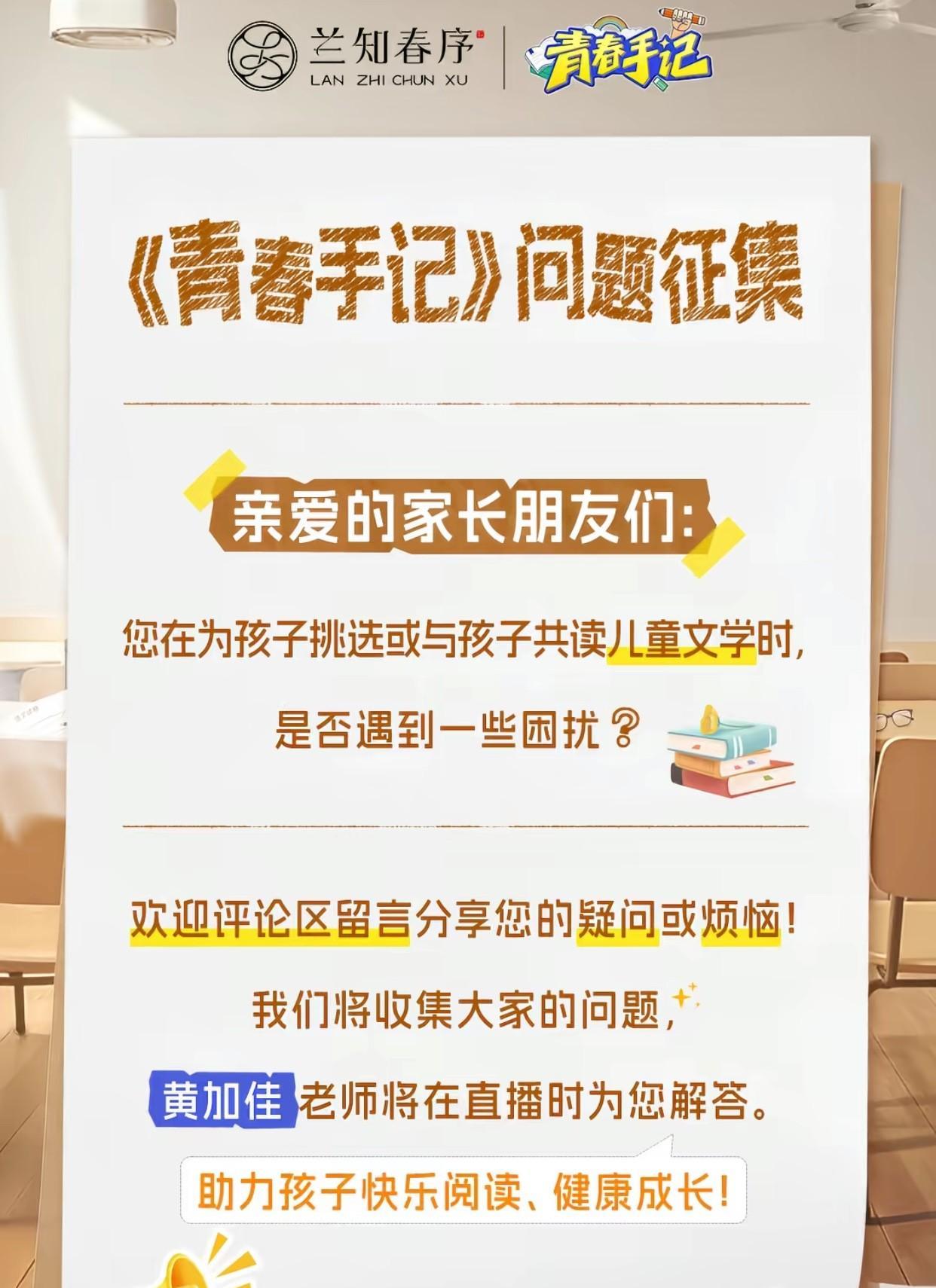 兰知春序又放大招了 8月4日新栏目“青春手记”即将开播 邀请了知名儿童文学作家黄加佳老师 做客直播间,为家长们答疑解惑 而且是4、5日连着两天,晚上7点开始 现在正在向家长们征集问题 有这方面烦恼的家长们可以去账号留言 专门去查了一下黄加佳老师的履历 她的作品荣获中国十佳儿童文学 入选中国童书榜100佳 并被很多专家推荐阅读 深受家长、老师和孩子们的喜爱 兰知春序在找专家这方面确实用心了 不仅名头要好,还得有实践经验才行[耶] #头号创作者激励计划#