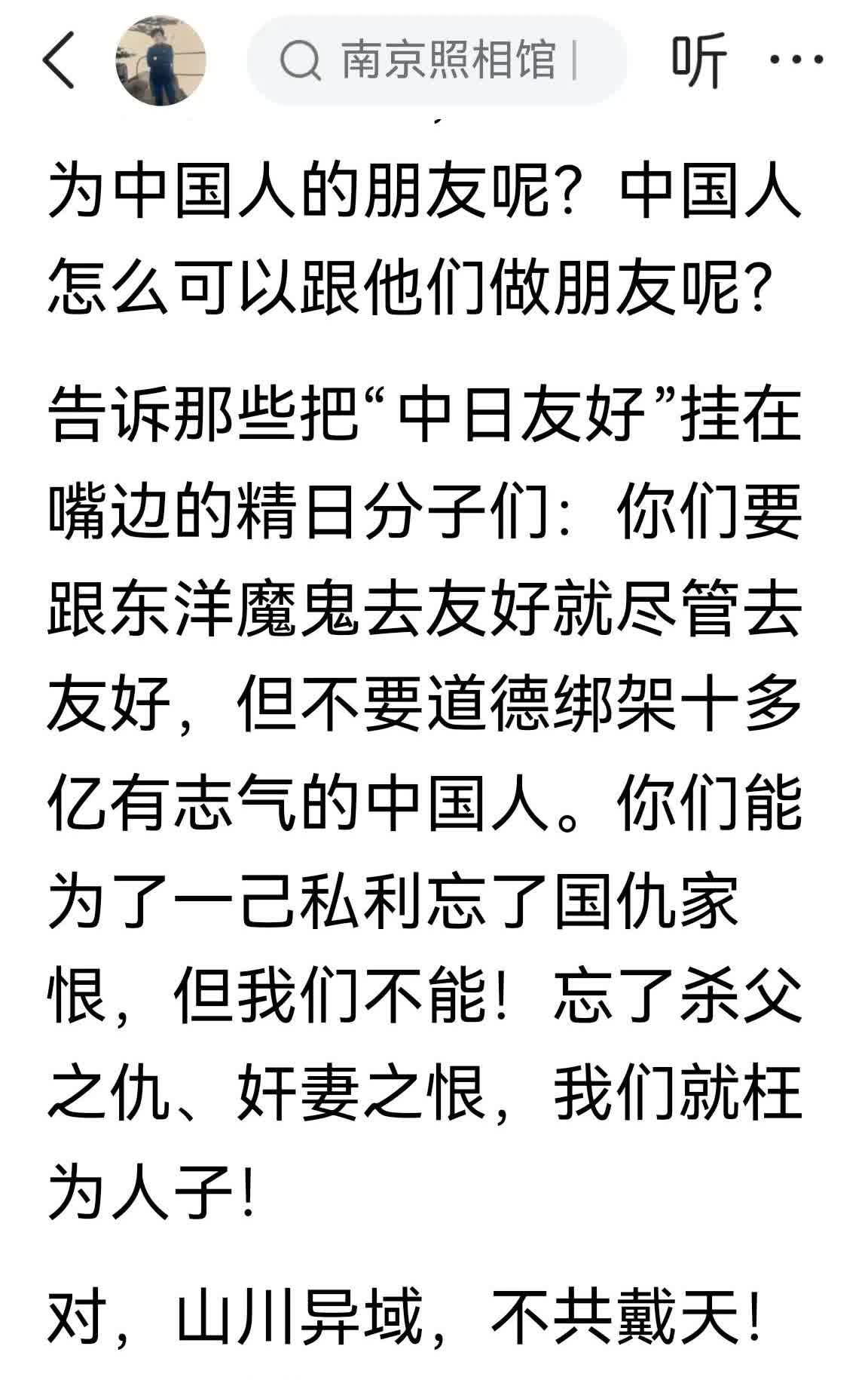 “我们不是朋友,永远都不是!” 这是中日关系永远的实质!从头再来0522文章,写得很好,我深以为然。 作者怒斥那些“胸襟广阔”忘记国家仇恨的人: 台湾有事,就是日本有事!这话不是日本人说的?拒不认罪挑衅中国人民参拜靖国神厕的不是日本人?这样的强盗、流氓民族,怎么可以成为中国人的朋友呢? 作者称,精日分子们,你们要跟东洋魔鬼去友好就尽管去友好,但不要道德绑架十多亿有志气的中国人。