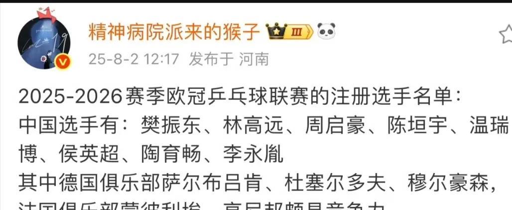 2025-2026赛季,欧冠乒乓球联赛的国乒注册选手名单: 中国选手有:樊振东、