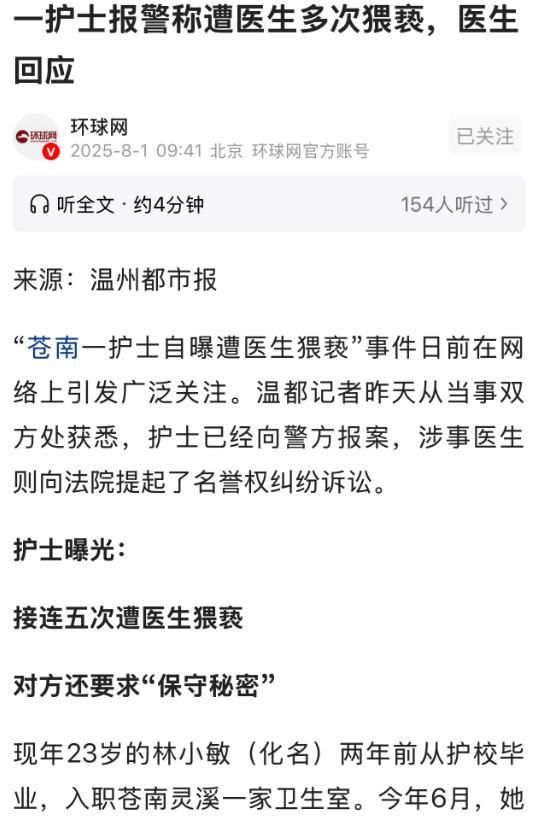 浙江温州,23岁女护士林小敏初入职场就遭男医生李兵多次骚扰,从动手动脚到强行猥亵,小敏因初来乍到选择隐忍,最终精神崩溃辞职。辞职后她曝光并报警,李兵却反咬一口告其侵犯名誉权,好在小敏有录音反击。双方各执一词,网友大多支持小敏,此事真相究竟如何,令人好奇。 据2025年8月1日环球网报道:一边是初入职场满心憧憬的年轻女孩,本想在岗位上发光发热。另一边却是心怀不轨的前辈,把职场当成了自己的狩猎场。 林小敏,一个23岁刚从护校毕业的女孩,带着对未来的无限期待,进入苍南灵溪这家卫生室的大门。她浑身散发着青春的活力,满心想着要在这里好好干出一番成绩。 然而,从2023年底开始,同卫生室的男医生李兵见小敏年轻漂亮,便起了歹心,5次对她动手动脚。 小敏初来乍到,人生地不熟,又怕丢了这份来之不易的工作,只能选择隐忍,把所有的委屈和痛苦都咽进了肚子里。 然而,她的隐忍并没有换来李兵的收敛,反而让他得寸进尺。不久后,李兵竟然把小敏骗到了监控死角,对她进行了强行猥亵。 那一刻,小敏的精神防线被彻底击溃。最终,她心灰意冷地选择了辞职。 辞职后的小敏,终于有了勇气面对现实。她曝光了此事,并且果断地报了警。 她以为,正义照亮这个黑暗的角落。然而,事情的发展却让她再次陷入了更抓狂的境地。 李兵这个无赖,竟然反咬一口,告小敏侵犯他的名誉权。这简直就是胡扯!小敏明明是被害者,却还要遭受这样的污蔑,这让她如何能咽下这口气? 不过,奇迹总是会在最绝望的时候出现。小敏手中有一份录音,在这份录音里,李兵承认了自己的错误,还苦苦哀求小敏保密。 这简直就是铁证如山,足以证明李兵的罪行。有了这份录音,小敏就像有了尚方宝剑,终于可以为自己讨回公道了。 此事中,双方各执一词,网友们大多支持小敏。毕竟,谁会拿自己的名誉开玩笑呢? 小敏的遭遇,引起了大家的关注和同情。大家都在期待着,法律能够还她一个公道,让那个可恶的李兵受到应有的惩罚。 刚进入卫生室的她,对职场充满了美好的幻想。而李兵,作为一个在卫生室工作多年的老工作者,本应该起到传帮带的作用,帮助小敏尽快适应工作环境。 然而,他却心怀不轨,故意而为,把职场当成了自己满足私欲的地方。 他明知自己的行为会给小敏带来伤害,却仍将这种伤害一次次地施加在小敏身上。这是一种道德上的败坏,更是对法律的挑衅。 当时,小敏的隐忍也是一种无奈之举。她刚进入职场,没有经验,没有背景,面对李兵这样的“老油条”,她根本不知道该如何应对。 她害怕丢了工作,害怕被人嘲笑,所以只能选择默默忍受。但是,她的隐忍并没有换来和平,反而让李兵更加肆无忌惮。 在职场中,不能一味地隐忍,当自己的合法权益受到侵害时,要用法律保护自己。 至于李兵反咬一口告小敏侵犯名誉权,这简直就是疯狂之举。他明知自己的行为是见不得光的,却还想通过这种方式来逃避法律的制裁。 然而,他忘了,法律是公正的,不会因为他的狡辩而改变事实。小敏手中的录音,让他的阴谋无法得逞。 李兵对小敏的多次动手动脚以及强行猥亵行为,符合《刑法》第二百三十七条关于强制猥亵、侮辱罪的规定。该条款明确指出,以暴力、胁迫或者其他方法强制猥亵他人或者侮辱妇女的,处五年以下有期徒刑或者拘役。 李兵明知自己的行为会对小敏造成身体和心理上的伤害,却故意为之,将小敏骗至监控死角实施猥亵,这种行为严重侵犯了小敏的人身权利和尊严,应当受到法律的严惩。 李兵反咬一口告小敏侵犯名誉权,名誉权是指公民或法人保持并维护自己名誉的权利。 在本案中,小敏曝光李兵的违法行为,是基于事实的真实陈述,并非故意捏造事实诽谤李兵。 根据《民法典》第一千零二十四条规定,民事主体享有名誉权。任何组织或者个人不得以侮辱、诽谤等方式侵害他人的名誉权。 而小敏的行为是为了维护自己的合法权益,揭露李兵的丑恶行径,不属于侵害名誉权的行为。 李兵故意颠倒黑白,试图通过这种方式来逃避法律的制裁,这种行为不仅不道德,而且违反了法律的规定。 从证据来看,小敏手中的录音是关键证据。这份录音清晰地记录了李兵承认自己犯错并求保密的内容,足以证明李兵的违法行为。 在法律程序中,证据是认定案件事实的重要依据。这份录音的真实性和合法性都得到了认可,它清晰地映照出李兵的罪行。 而李兵却无视这份证据的存在,依然顽固地坚持自己的错误观点,这只能说明他的无知和愚蠢。 综上所述,李兵的行为,应当承担相应的责任。他的所作所为,是对法律的蔑视,是对公序良俗的严重破坏。 期待法律能够公正地审理此案,让李兵受到应有的惩罚,还小敏一个公道,让正义得到伸张。您对这件事有什么看法呢? (来源:2024年8月1日环球网) #头号创作者激励计划#