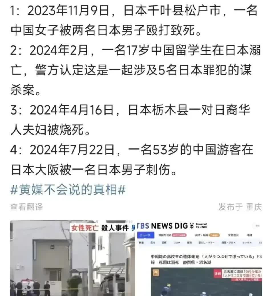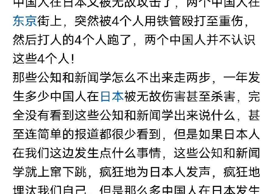 日本人在中国发生点什么事,国内媒体和大V就一窝蜂地炒作,把国人说得一文不值,而这几天日本多地发生多起针对中国游客的袭击,国内的新闻几乎没人报道,除了个别的媒体有轻微提一下,流量也非常少,各种大V也都是看不见,再看看日本媒体和大V,它们的做法跟我们的媒体和大V完全相反,日本人在中国出事,它们疯狂炒作,然后中国人在日本被袭击,几乎不见新闻,所以国内这群媒体和大V招人厌烦不是没有原因的,不说别的,7月30和7月31日,分别在东京和大阪就发生两起针对中国游客的暴击袭击,用铁管把中国游客打得满身是血,还有一个中国游客只是一个19岁的学生,被暴力抢劫,被打伤,手机钱包也被抢走,这些事情国内的媒体几乎都不报道,只有少数官媒报道而已!