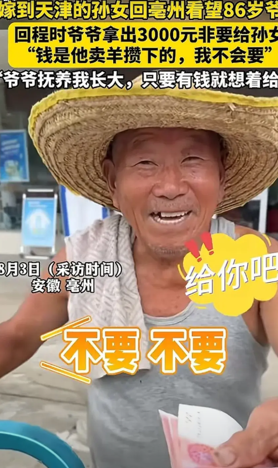 今年暑假,女子陪伴爷爷长达一个月。在启程回天津时,爷爷满脸笑容地拿出卖羊所得的三千元递给孙女,说道:“妮儿,拿去买点好吃的。”