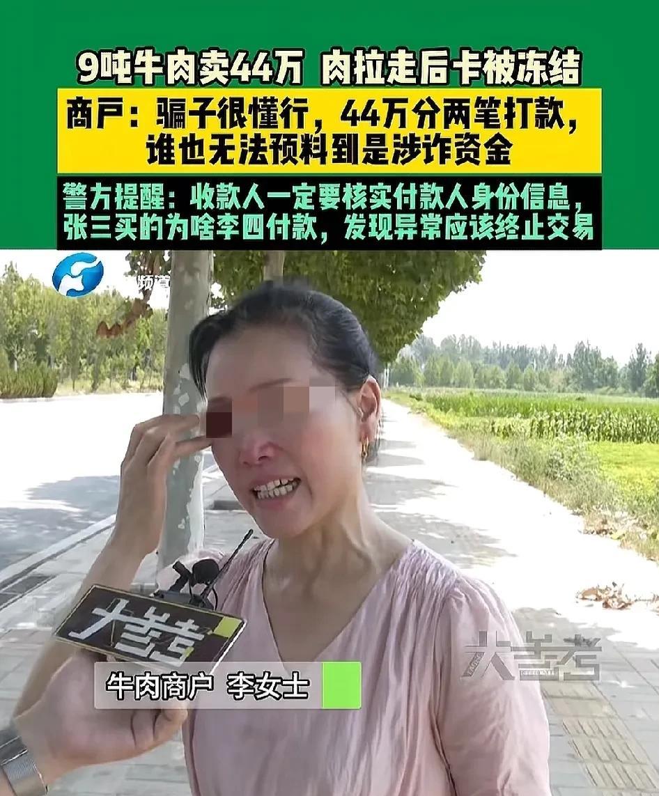 卖了44万牛肉,河南商户李大姐的钱款被冻结,欲哭无泪… 原因是,商户李大姐做成了一笔44万牛肉的销售生意,可当对方钱款第二次打进来的时李大姐的账户也被冻结了。 经了解,李大姐的账户现在仍可以正常收付款,只是冻结了账户里面涉诈的部分钱款。办案民警还表示,如果商户李大姐一开始就核对打款人信息就会避免这样的尴尬。 被问道,以后其他人如何避免此类事再发生时。 办案民警给出建议,如张三买的牛肉为啥李四付款,发现类似的异常现象应该终止交易。 其实还有一点,就是商户突然接到不熟悉的大单时也要警觉,避免钱款给自己带来麻烦。 复盘商户李大姐上套的过程,应该是李大姐按照正常交易流程,先收了对方一部分定金,这第一笔定金应该是没有问题的,当对方拉走全部牛肉结算的尾款出现了问题。 而对方付款的借口可能是先前账户里的钱不够由另一个账户代付。 这时如果商户李大姐再谨慎一些就会避免后续的麻烦。 朋友们,你们对此事怎么看? 欢迎大家在评论区探讨,留言…[送心]
