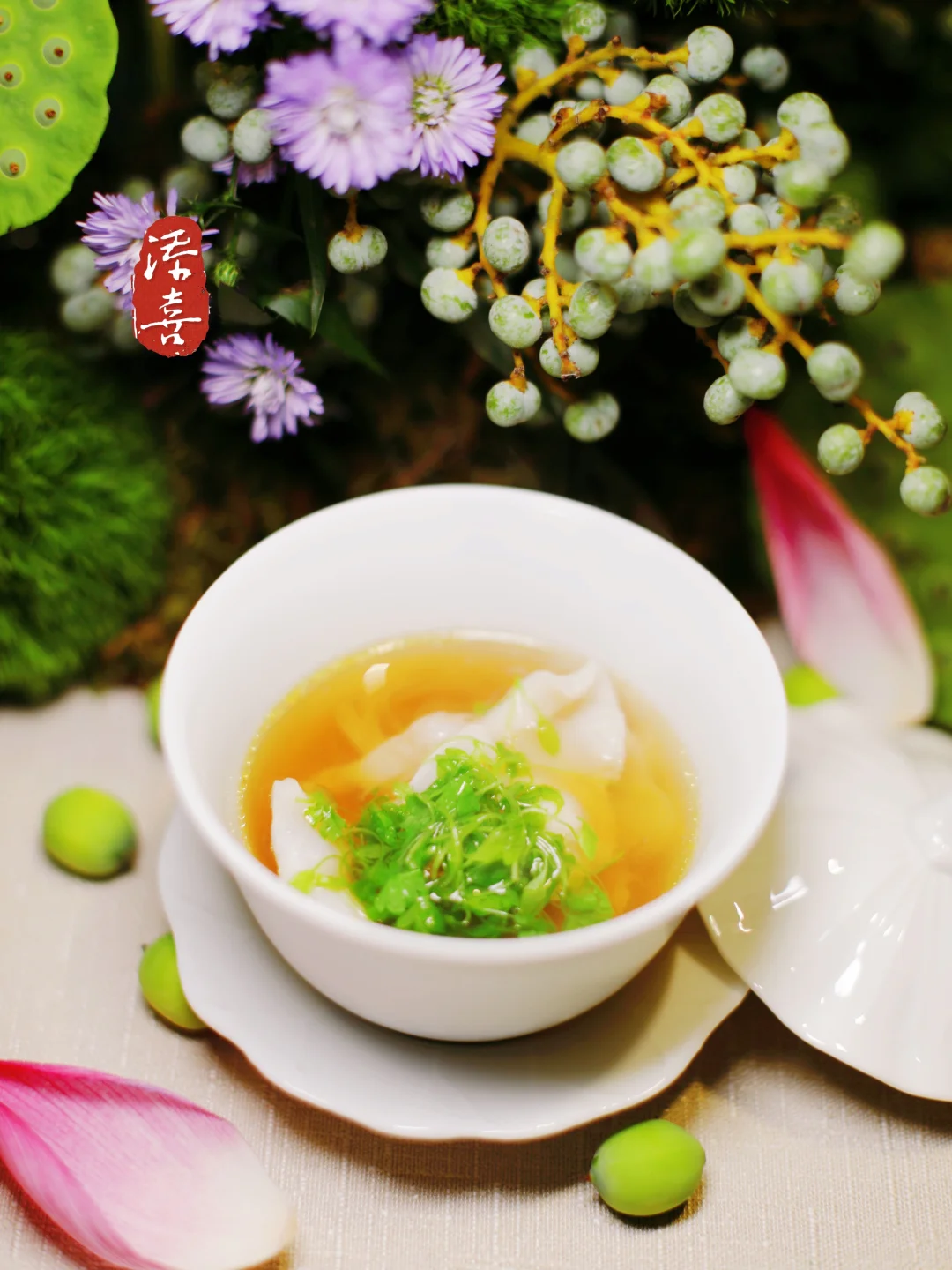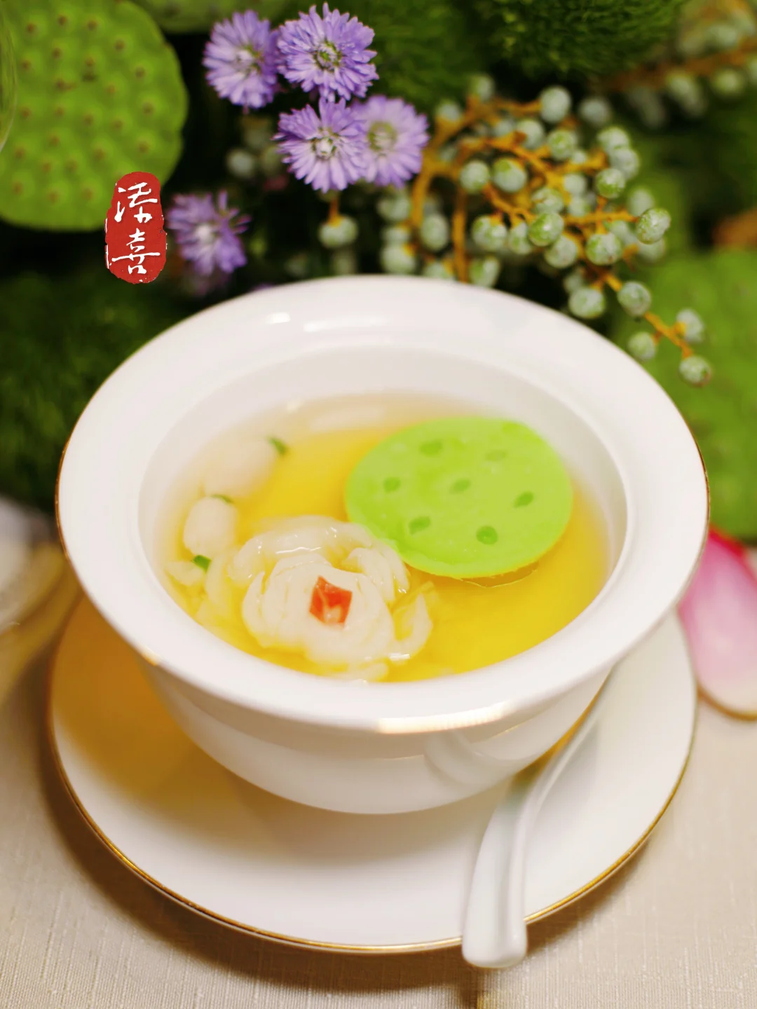 "毕竟西湖六月中,风光不与四时同。接天莲叶无穷碧,映日荷花别样红"杨万里的诗,终被熬成了一碗汤。慢炖6小时的清汤,搭配九年兰州百合,浮着的一朵“莲蓬”——山药泥捏成蓬房,甜豆作莲子,竹荪裹虾藕为节。舀一勺,鲜得像是喝下了整片西湖的月光。