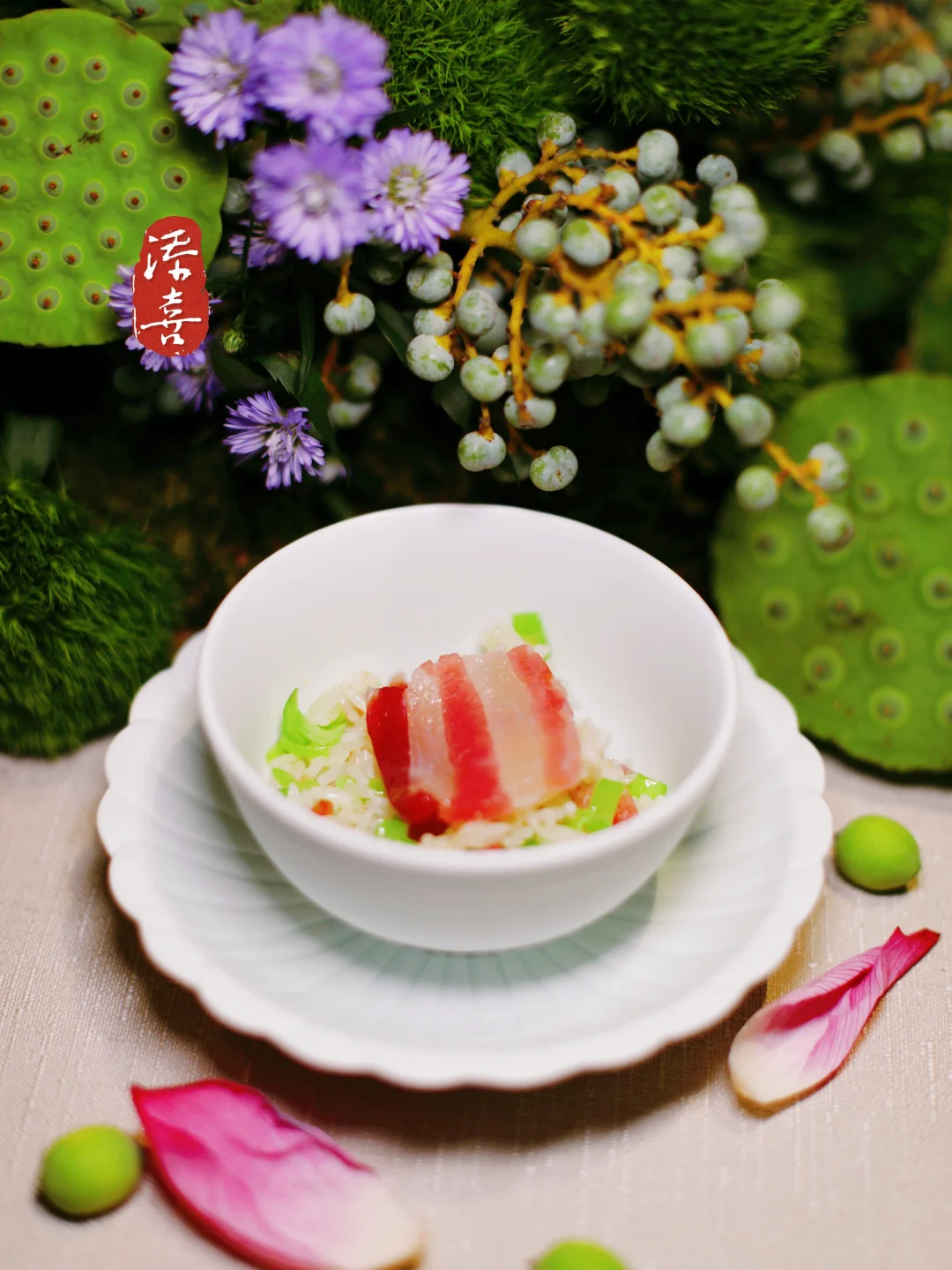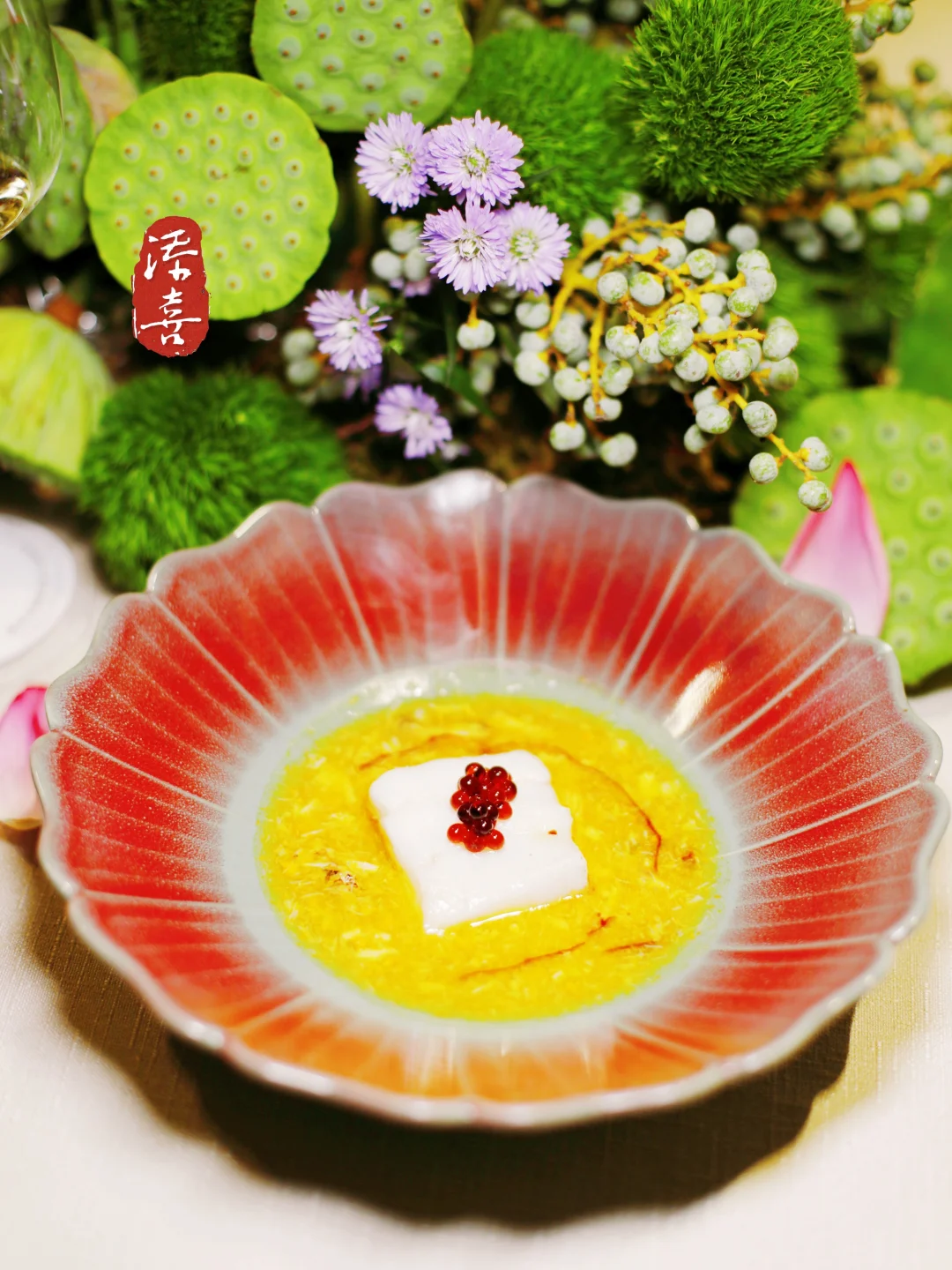选取了钱塘江七彩黄金鲤鱼的鱼背肉,米鱼的背肉细嫩如绸,蟹粉金黄浓醇,再淋上15年陈的卡萨诺瓦醋——酸香勾出鲜甜,竟吃出了几分南宋古宴的奢靡。