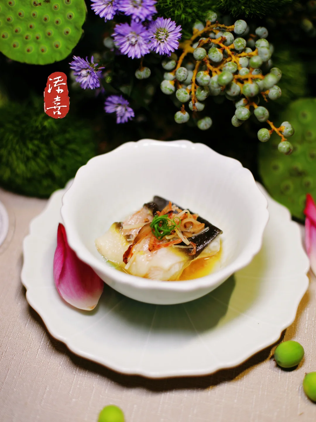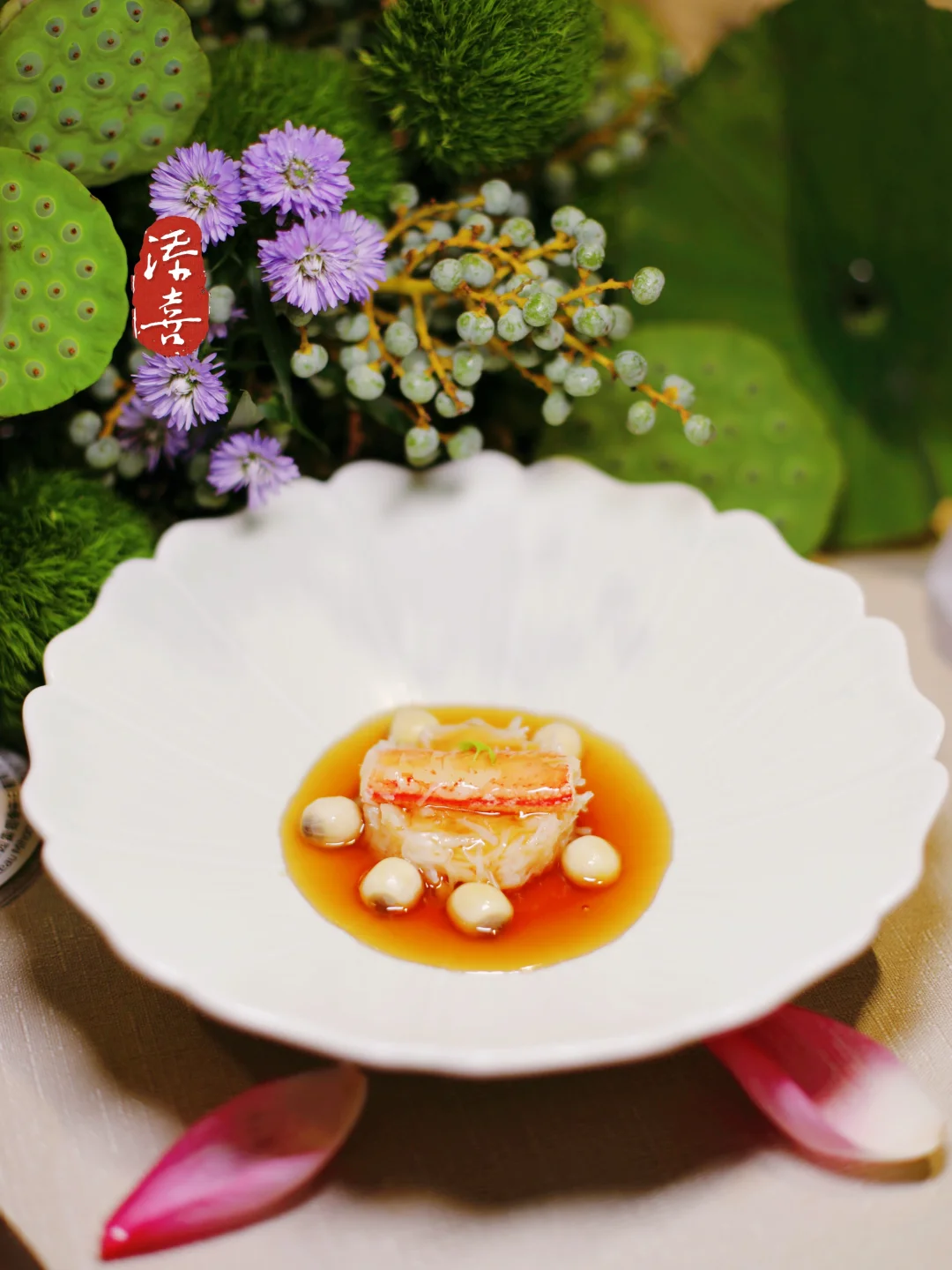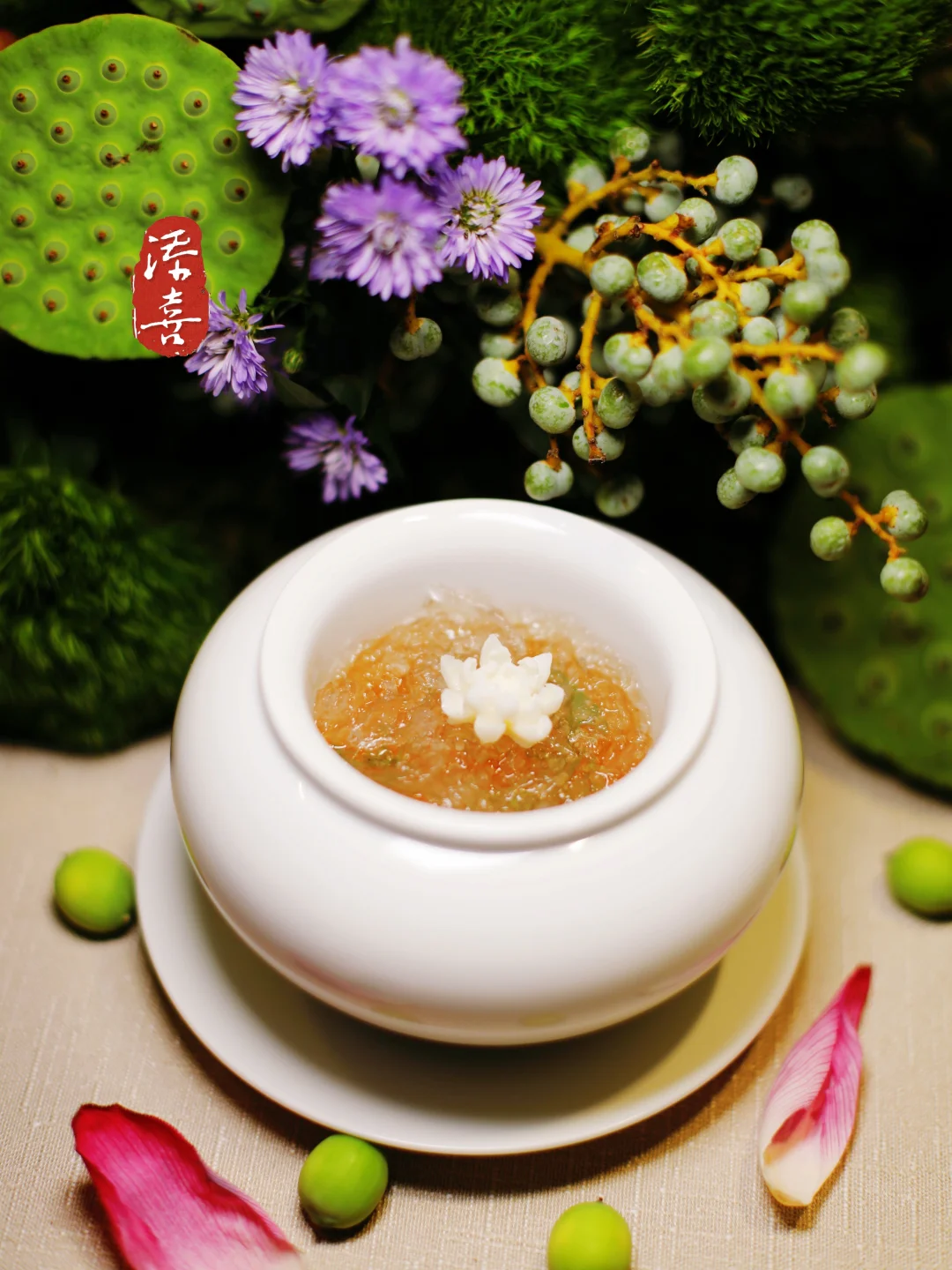 茉莉花茶与莼菜芽制成的鱼胶冻,上层覆着官燕。一勺清凉滑入喉,仿佛吞下了整座西湖的夏天——荷香、月光、晚风,都成了身体里的一部分。