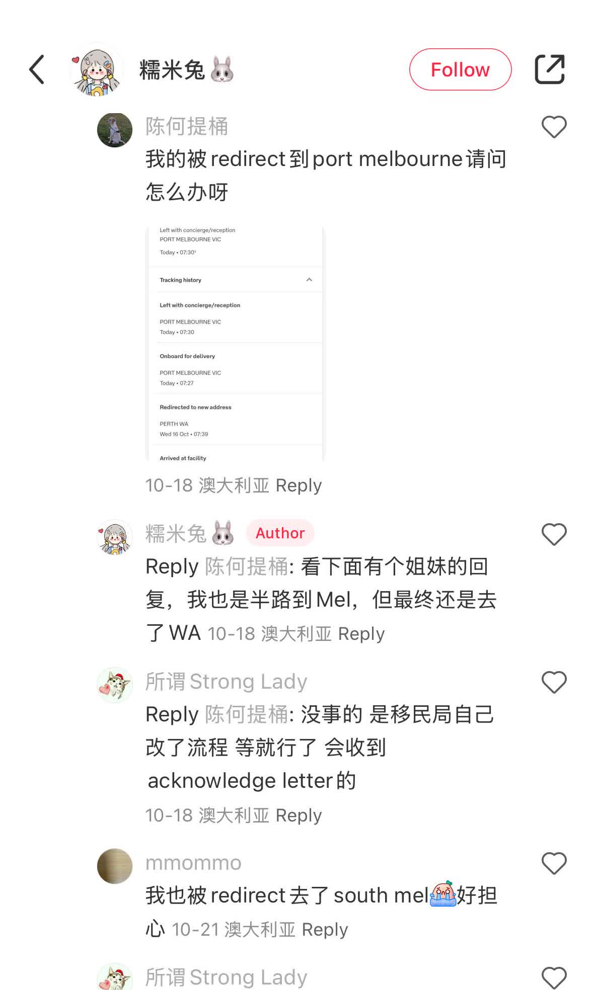 据报道,近日有澳人在Tiktok上怒斥澳洲邮政局(Australia Post),竟然在他的包裹在即将送达家门口时,又被莫名转送往千里之外。 Jay Morgan讲述,他们从墨尔本订购的包裹已抵达昆州东南部的配送中心,眼看就要到家门口,却不料包裹在距家仅五分钟车程时,又突然被转运至南澳。 “它明明已经到昆州东南部了,离我家就五公里路。这操作合理吗?Australia Post你们在搞什么?” 我也举一例: 《小红书》有网帖称,864、884境内父母移民申请纸质材料按照澳大利亚移民局官网提供的邮寄地址寄往在西澳首府帕斯(Perth)的“父母签证中心”(Parent Visa Centre), 却等申请材料到了签证中心后,又被转发(redirected to the new address)给维州墨尔本(Port Melbourne V IC)的某签证部门。 我就纳闷了,为什么不修改“邮寄地址”,让申请人直接将申请材料邮寄给Port Melbourne VIC的签证处理部门呢? 澳洲邮政局和澳洲移民局签证部门绕圈子邮寄包裹和申请材料为那般? 附小红书相关网帖:
