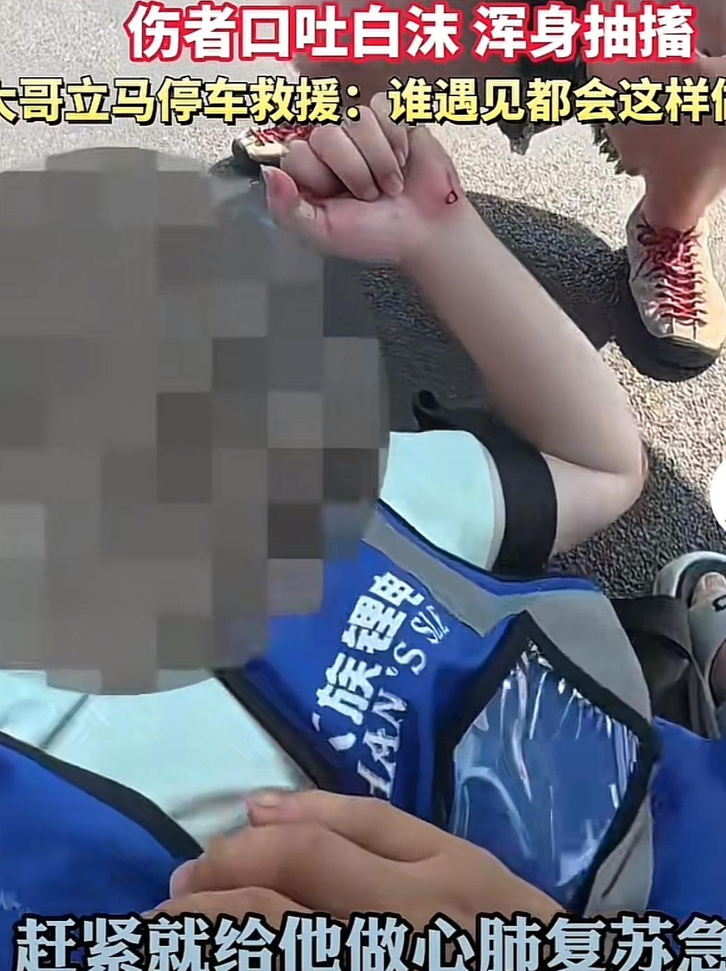 兄弟,不要睡,你家人在等你!爸爸妈妈在家等你! 一小伙遭遇车祸,受伤后倒在地上,这时,一位路过的大哥发现小伙脸色惨白,浑身抽搐,口吐白沫,他很着急,他说虽然自己不懂,但他想到了电视上那些急救画面,就没有丝毫犹豫,立刻对他进行心脏复苏。 但是经过一段时间的施救后,看小伙没有反应,大哥很着急,就怕他这样睡过去,就不断的呼喊他:“兄弟,不要睡,不要睡,爸爸妈妈在家等你!”视频中,明显的听的出大哥的呼喊已带有哭腔。 还好,小伙在大哥的千呼万唤声中慢慢苏醒,这时救护车也已经赶到,小伙上在抬上救护车时是清醒的状态,大哥说小伙的家人已经赶去照顾他,目前已经脱离危险,自己也总算松了一口气。 小伙遭遇是不幸的,但遇到善良的大哥又是幸运的 。在人性淡薄的今天,陌生人的生死营救,确实让人感动。就像冬日里的暖阳,不炙热,却很温暖!