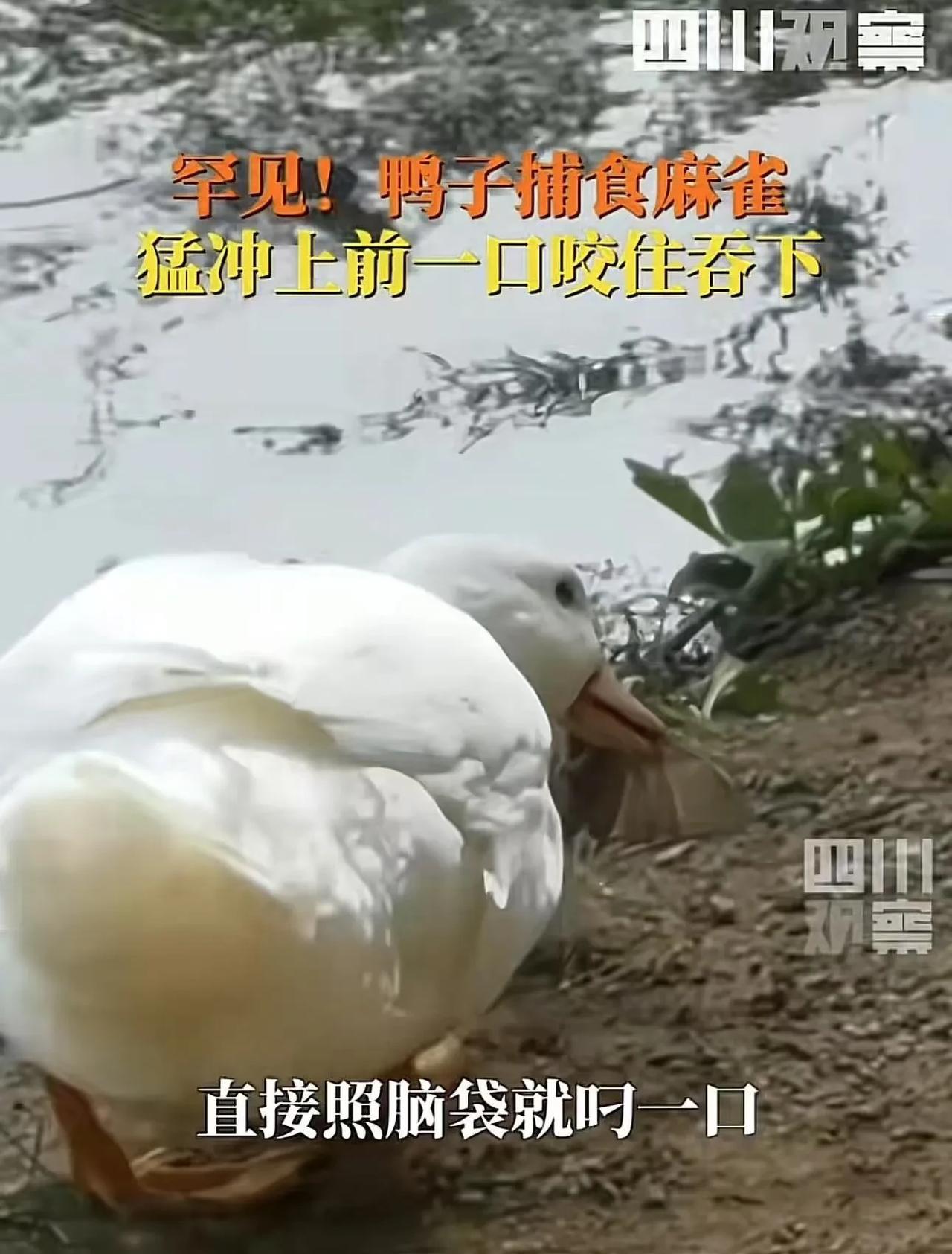 鸭子居然是猛禽?内蒙古呼和浩特一公园,男子在公园看到鸭子捕猎麻雀瞬间,一口吞下一只麻雀,连吞好几只!男子:“很迷糊,一直以为鸭子很和善!网友:和尚都不是吃素的!鸭子开开荤怎么了? 男子带着孩子来到公园游玩,公园里养着几只鸭子。孩子一看到它们,便嚷着要近距离观赏。 男子宠溺地笑着,带着孩子走进。就在这时,一群麻雀叽叽喳喳地飞来,落在河边准备觅食休憩。 其中一只鸭子猛地发力,如离弦之箭般冲了上去,以迅雷不及掩耳之势,一口就将一只毫无防备的麻雀吞进了肚子里。 男子被眼前这突如其来的一幕惊得目瞪口呆,他活了这么大岁数,一直以为鸭子是温顺的“素食主义者”,只吃些水草、小鱼小虾之类的食物,没想到鸭子竟然还有捕食麻雀的“凶残”一面。 然而,这仅仅是开始。那只鸭子吃完一只麻雀后,似乎意犹未尽,又迅速调整方向,朝着另一只麻雀扑咬过去。 男子被这连续的意外深深震撼,急忙拿出手机,快速按下快门,记录下了这罕见又震撼的一幕。 此事引发了热议,有网友说,天呐!鸭子吃下带毛的麻雀,它怎么能消化呢?难道鸭子变基因了!吃腥了!太恐怖了! 也有网友说,这是番鸭。这家伙连水蛇都一口吞。也能短距离的飞。比我们本土鸭子凶多了。 还有网友说,老鼠都吞,小时候家里养了四只大白鸭,有一天喂鸭子正好看到一只老鼠经过鸭圈,就看到平时呆头呆脑的鸭子光速追过去一顿啄,我正惊呆之际看到鸭子一仰头直接嗦进去了! 其实很正常,鸡鸭鹅都是杂食动物,消化能力很强,毛发都不是事,鸭胗里面全是碎石小颗粒帮助碾碎消化食物。 鸭子的消化液很厉害,化贝壳骨头等,都是小菜一碟。坊间治鱼刺卡喉咙,好多都用鸭子的口水滴来清除。虽然恶心些,但总比鲠在喉强多啦!