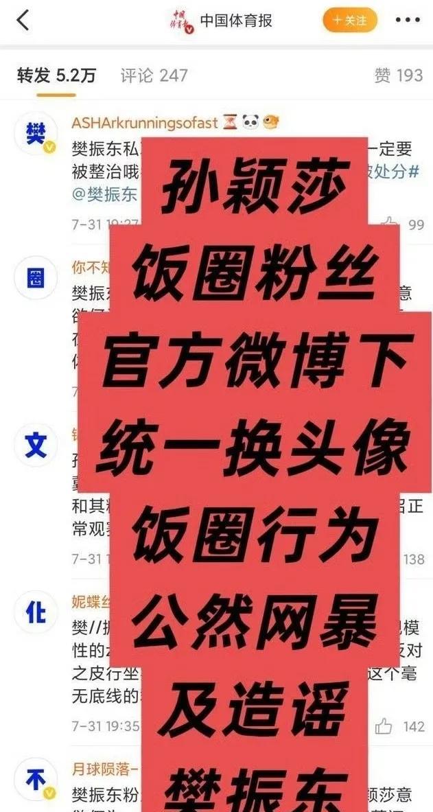 有些粉丝,能夸张到什么地步呢? 昨天,央 视体育发文庆祝陈梦巴黎女单冠军一周年,文案是: “看陈梦如何把赛场上千百次的挥拍,化作赛场里落点精准的进攻……” 一句“落点精准的进攻”,让一群人仿佛臭蚊子看到了血! 她们纷纷在官 博下阴阳怪气,评论什么“天亮了、真相大白了、懂的都懂、还是央妈有水平、跟央妈走支持现役等等”。 以自证她们口中所谓的“梦马落点”,所谓“使阴招、背刺、偷研究了莎莎落点。” 还有人长篇大论地表达 队友之间不能互相研究,不能专打对方落点,否则就乱套了等等。 以及,我翻看过一些人的主页,这些人里作为群体大多数的女性,她们却对女性的恶 意特别大。 前有孙颖莎被混双搭档的极端粉造huang谣7000条事件,我作为樊振东球迷,当时也曾为孙颖莎发声,就像今天也会陈梦发声一样。 现在,她们也无所不用其极地这样侮/辱马琳、陈梦,陈熠,樊振东,她们时刻把“搂抱”二字挂在嘴边,认为但凡别人赢了比赛,就与“搂抱”离不了关系。(下图四) 以前看到网友犀利的评论,说这是极端粉“失金 疯”的症状,可能要持续很久,我觉得这样说太刻薄,现在竟也理解了。 更恶劣的是上周。 7月31日,厦门大学生辱/ 骂王楚钦孙颖莎一事发酵,中国体育报也为两位运动员发声,引导反对饭圈文化。 本来这是一件很正能量的事,可她们在小群内策划花钱买水 / 军、点赞、转 评,在中国体育报这条官 博下依次排字,统一时间、统一更换头像,所以,我们看到的,就是这条官博评论区最前排显示的“樊圈文化不可取”这七个同一形式的蓝色大字!(下图三) 这种公然挑衅官 媒,在引导反对饭 圈文化的官 方 博 文下,公然网/曝运动员樊振东的行为,竟还被她们沾沾自喜地拿来炫耀,原因是她们认为该厦门大学生是樊振东粉丝,但事实已经证明他与樊振东并无半点关系,大家现在也都知道了。 这些人,她们自己口口声声说着“饭 圈文化不可取”,却明目张胆地在官博下行“网/ 曝他人之事”,实为贼喊捉贼、可 恶至极! #头号创作者激励计划#
