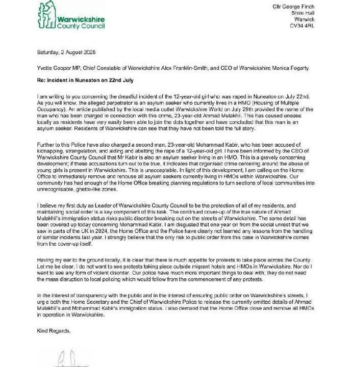 昨天,两名阿富汗移民在英国沃里克郡纽尼顿强J了一名12岁女孩,而后沃里克郡警方建议当地议员和官员不要透露嫌疑人是寻阿富汗的前政府流亡者,担心这会“加剧社区紧张局势”,当地警方认为英国民众的抗议比移民强J儿童更恶劣。 然而,掩盖真相的企图被泄露给了《每日邮报》,该报披露了嫌疑人的姓名、原籍国和移民身份。如果没有这位匿名举报人的举报,英国公众可能仍然无法了解纽尼顿这起犯罪的严重性以及嫌疑人的个人资料,因为当地警方拒绝透露任何有关该事件的细节。 这件事促使沃里克郡改革英国议员乔治·芬奇致信内政大臣伊薇特·库珀和沃里克郡警察局长,要求公开这两名移民的移民身份,以避免之前多次发生的掩盖真相事件重演。他还要求内政大臣停止用巴士将移民送往他的郡,这标志着英国地方政府首次就为移民提供住房并免除其犯罪后果的政策与伦敦中央政府发生冲突。