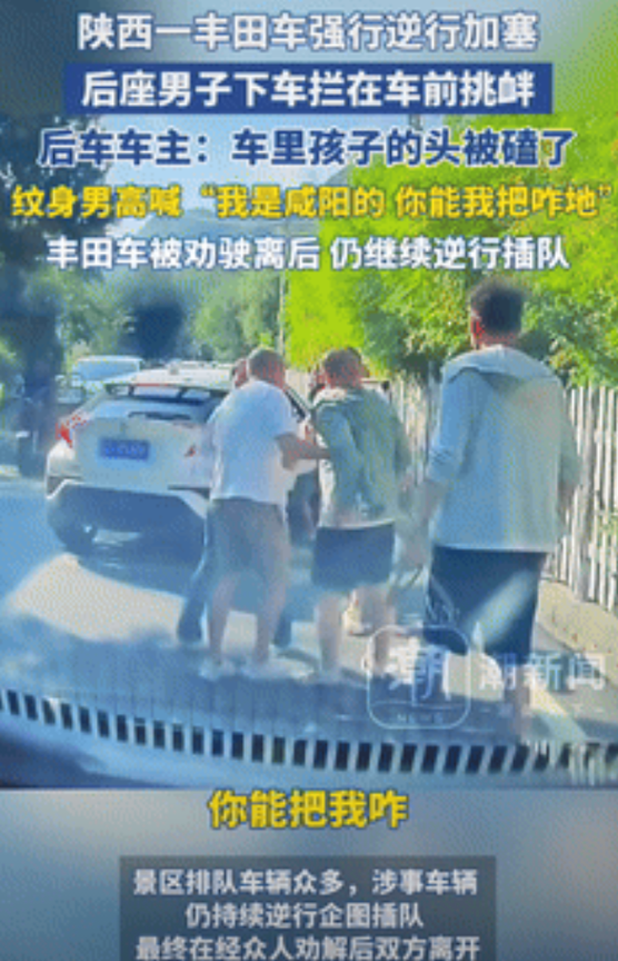 好大的威风!陕西西安,一男子自驾去景区游玩,可在排队进去时,遇到一辆车强行逆行加塞,甚至对方车里还下来一个人,将男子给逼停,双方发生冲突后,又下来个纹身男,语气十分嚣张的说:你能把我咋地! 据潮新闻8月5日报道,男子开车带着家人,准备到朱雀国家森林公园玩,因游客太多,公园入口那里有些拥挤。 不过大家都很秩序的依次排队进入,然而,有辆白色轿车却非要当“现眼包”,猛地就从后面逆行窜出来。 随后从后座就下来个男的,二话不说就站在男子车前面,强行将他给逼停,同时还在那里挑衅。 因为事发比较突然,男子看到后急忙踩刹车,以至于孩子都磕到了头,紧接着他就下去找对方去理论。 然而,在此过程中,那辆加塞车上有下来个纹身男,其态度十分的嚣张,还狂言:“你能把我咋地”。 与此同时,周围的群众害怕双方发生冲突,就纷纷过来劝阻,就这样事态才没继续发展,接着双方就离开了。 不得不说,喜欢嚣张的见了不少,可如此嚣张的还真是少见,感觉在这种人眼里,貌似法律都没有什么用了,所以才能如此嚣张跋扈,目中无人。 建议好好的查下其身份,说不定真有什么意外收获,也希望当地交警能给力些,该扣分就赶紧扣分,最好是民警能够出手,将其给拘留起来,好好灭一下他们的嚣张气焰。